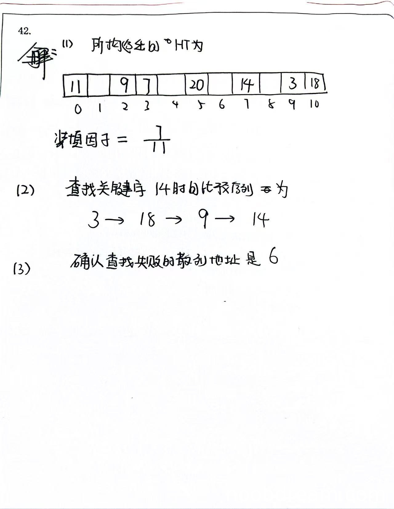 学生答案中给出了散列表内容“11 9 7 20 14 3 18”和装填因子7/11。但标准答案要求画出散列表HT,即明确每个关键字在长度为11的散列表中的具体位置(索引0到10)。学生仅列出关键字序列,未按索引位置排列,也未体现冲突解决后的最终分布(例如关键字9、14、7的最终位置与标准答案不同)。此外,装填因子计算正确。由于未正确画出散列表,扣3分。得3分。