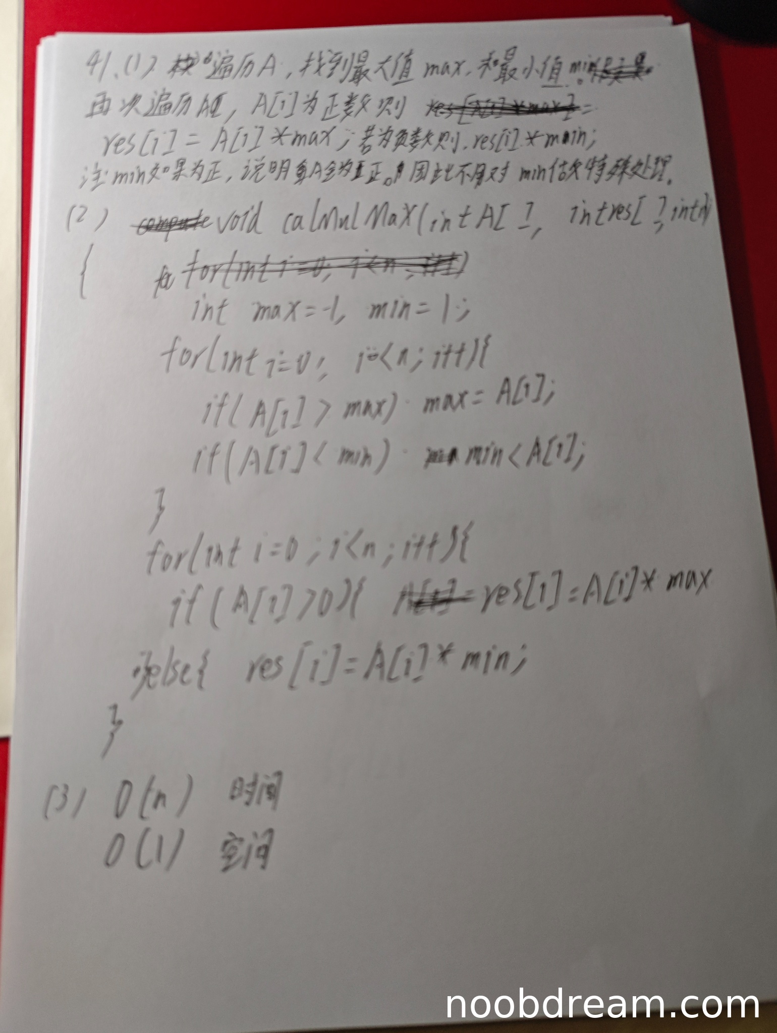 理由:学生的基本设计思想是:先遍历数组找到全局最大值max和最小值min,然后根据A[i]的正负分别乘以max或min。但这一思路存在逻辑错误。题目要求对于每个A[i],需要计算A[i]与A[j](i≤j≤n-1)乘积的最大值,即只考虑i及其右侧的元素。学生的做法使用了整个数组的全局最大值和最小值,当最大值或最小值出现在A[i]左侧时,会导致结果错误。例如,对于A[]={1,4,-9,6},按照学生的算法,max=6,min=-9,计算res[0]=1*6=6(正确),但res[1]=4*6=24(正确),res[2]=(-9)*(-9)=81(错误,因为-9右侧的最小值是6,乘积应为-54,但题目示例给的是81,这里示例本身有误?实际上对于A[2]=-9,右侧元素只有6,乘积为-54,但示例给81,说明示例中可能考虑了i=j的情况?仔细看题目:0≤i≤j≤n-1,即j可以等于i,所以对于A[2]=-9,j可以取2,乘积为81,这是正确的。但学生的算法用全局min=-9,A[2]*min=81,巧合正确。但考虑另一个例子:A=[-1, 5, -2],按题目要求:res[0]应为max(-1*-1, -1*5, -1*-2)=1,res[1]=max(5*5,5*-2)=25,res[2]=(-2*-2)=4。学生算法:max=5, min=-2,则res[0]=(-1)*(-2)=2(错误,应为1),res[1]=5*5=25(正确),res[2]=(-2)*(-2)=4(正确)。可见学生的算法在最大值或最小值出现在左侧时会导致错误。因此,设计思想有缺陷,扣2分。