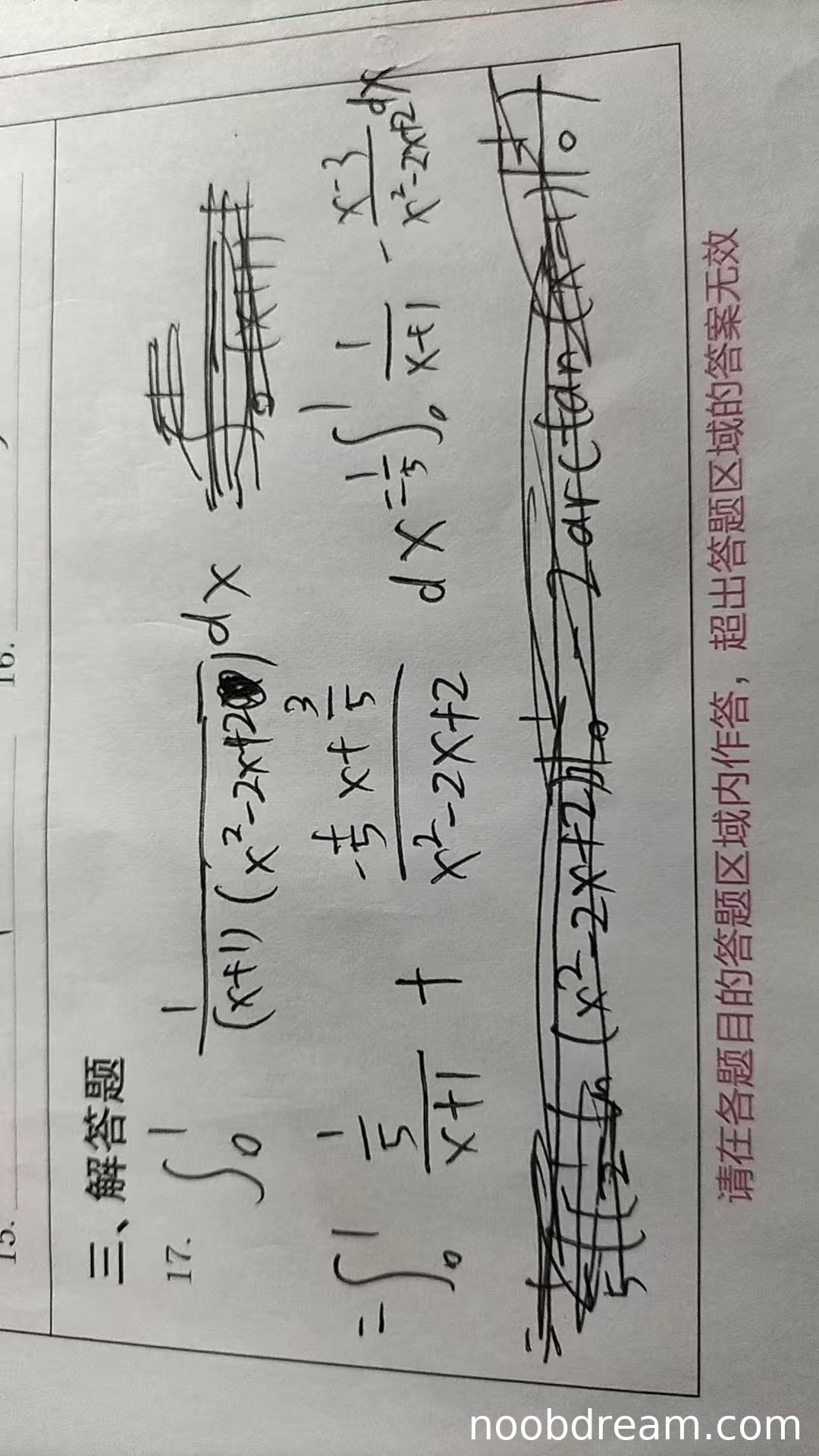 学生作答存在严重逻辑错误:题目要求计算的是 \(\int_{0}^{1}\frac{1}{(x+1)(x^2-2x+2)}dx\),但学生在第二次识别中错误地将被积函数写为 \(\frac{x}{(x+1)(x^2-2x+2)}\),并在整个计算过程中基于此错误表达式进行部分分式分解和积分。这导致最终结果与标准答案完全不同。尽管第一次识别结果在形式上与标准答案相似(系数有差异),但第二次识别明确显示了错误的被积函数,且最终答案为 \(\frac{3\pi}{20}-\frac{3}{10}\ln 2\),与标准答案 \(\frac{3}{10}\ln 2 + \frac{1}{10}\pi\) 不一致。因此,核心逻辑错误,扣分严重。但考虑到学生可能因识别问题误写被积函数,且部分步骤(如部分分式分解方法、积分技巧)正确,给予部分步骤分。扣分后得分为 3 分。