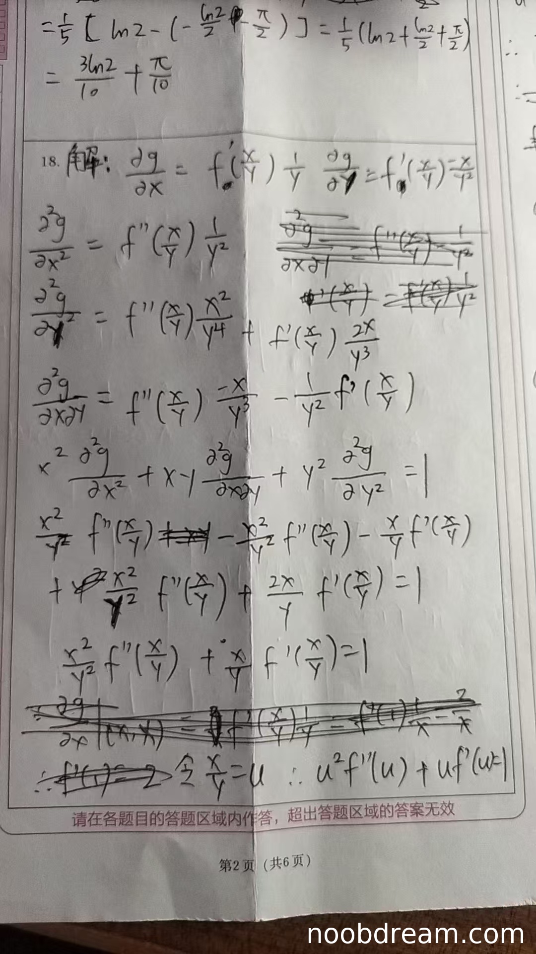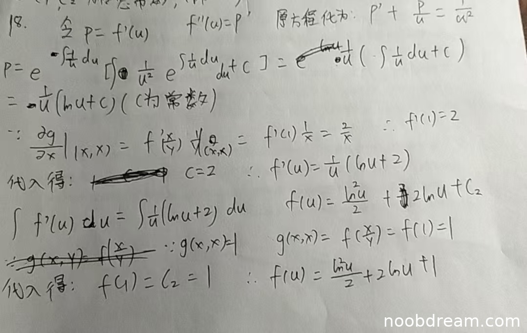 - 正确计算了所有一阶和二阶偏导数,并代入给定的偏微分方程,化简得到关于 \( f(u) \) 的常微分方程 \( u^2 f''(u) + u f'(u) = 1 \)。