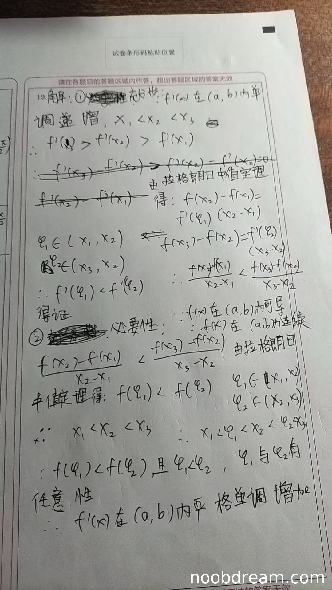 学生充分性证明逻辑混乱,存在严重错误。首先,学生将“导函数严格单调增加”误当作“函数单调递增”,混淆了函数与导数的关系。其次,证明过程中出现了无意义的等式 \(\frac{f'(x_3) - f'(x_2)}{f'(x_2) - f'(x_1)}=\frac{f(x_2) - f(x_1)}{f(x_3) - f(x_2)} = 0\),该等式既不成立也与证明无关。虽然后续应用了拉格朗日中值定理,但前提假设错误,且未能正确利用已知条件进行推理。因此,充分性证明基本无效,仅因提及了拉格朗日中值定理与结论形式,给予少量步骤分。