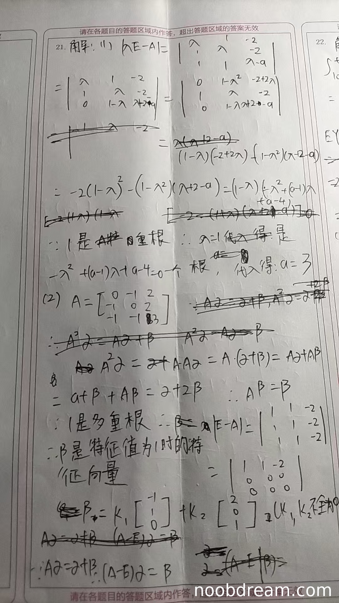 学生从已知条件推导出 Aβ = β,即 β 是 A 的属于特征值 1 的特征向量,这一步正确。在求解特征向量时,学生计算了 E-A(或 A-E)的矩阵,发现秩为 1,并给出了特征向量的一个基础解系表示。第一次识别给出的基础解系为 [1,0,0]ᵀ 和 [2,0,1]ᵀ,第二次识别给出的基础解系为 [-1,1,0]ᵀ 和 [2,0,1]ᵀ。第二次识别的解系是正确的(可以通过验证 (A-E)x=0 得到),第一次识别的 [1,0,0]ᵀ 并不是解(代入 (A-E)[1,0,0]ᵀ = [-1,-1,-1]ᵀ ≠ 0),但根据“两次识别只要有一次正确则不扣分”的原则,这里以第二次识别为准,认为学生正确求出了特征向量空间。