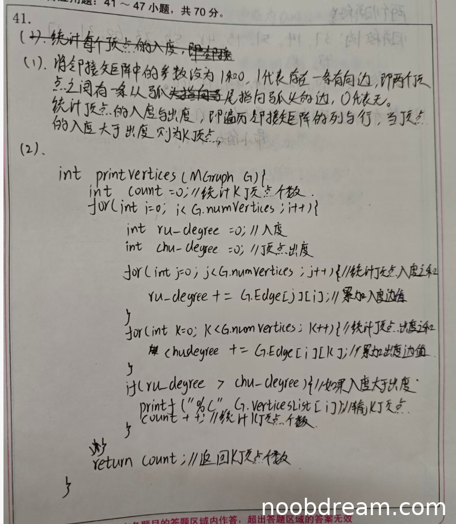 2. 变量名语法错误(仅在第二次识别结果中出现):使用了 ru - degree、chu - degree 等包含减号的变量名,这在C语言中是非法标识符。但根据“禁止扣分”原则,这很可能为识别错误(原手写答案可能是下划线),且第一次识别结果为正确的变量名(ru_degree),因此不因该错误扣分。