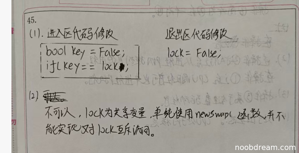 if (key == TRUE) swap key, lock; 的主要问题在于 if 应改为 while 以实现忙等待,而学生将其改为 bool key = FALSE; 和 if (key == lock);,这完全改变了原意,无法实现互斥。因此,进入区修改错误。lock = TRUE; 改为 lock = FALSE;,这与标准答案一致,是正确的。由于学生只正确修改了退出区(1处正确),但进入区修改错误(1处错误),且标准答案要求修改两处(进入区的if改为while和退出区的lock = TRUE改为lock = FALSE),因此给予部分分数。扣分:进入区错误扣2分,退出区正确得1分,本小题得1分。