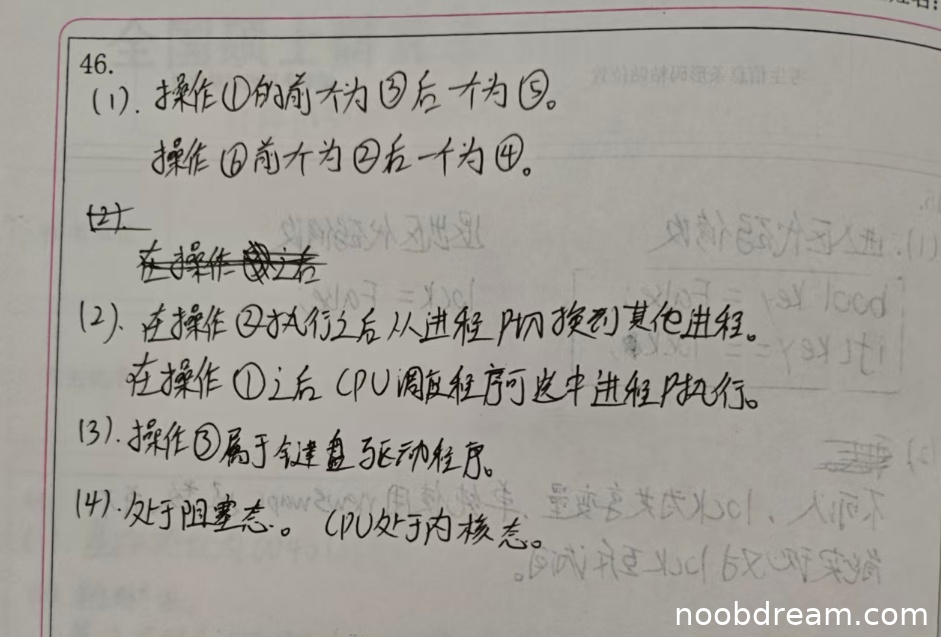 学生答案第二问:“在操作①之后CPU调度程序选中进程P执行”与标准答案“CPU调度程序才能选择进程P执行的操作是①将进程P插入就绪队列”完全一致,得1分。