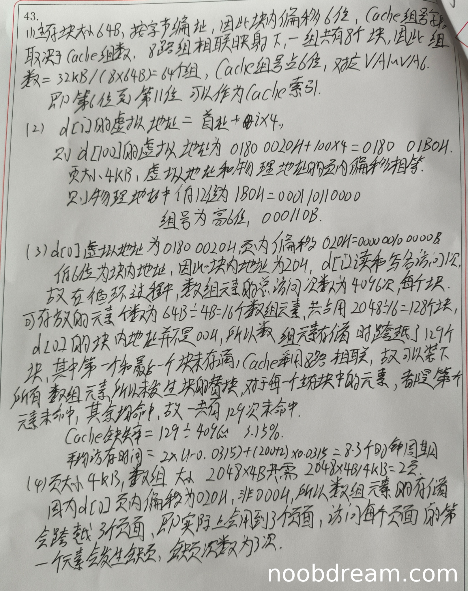 ② Cache缺失率:学生正确分析出数组元素跨越129个主存块,每个块第一个元素访问导致一次缺失,总缺失129次,总访问次数为4096次(2048次读+2048次写),缺失率计算为129/4096≈3.15%。此部分正确。