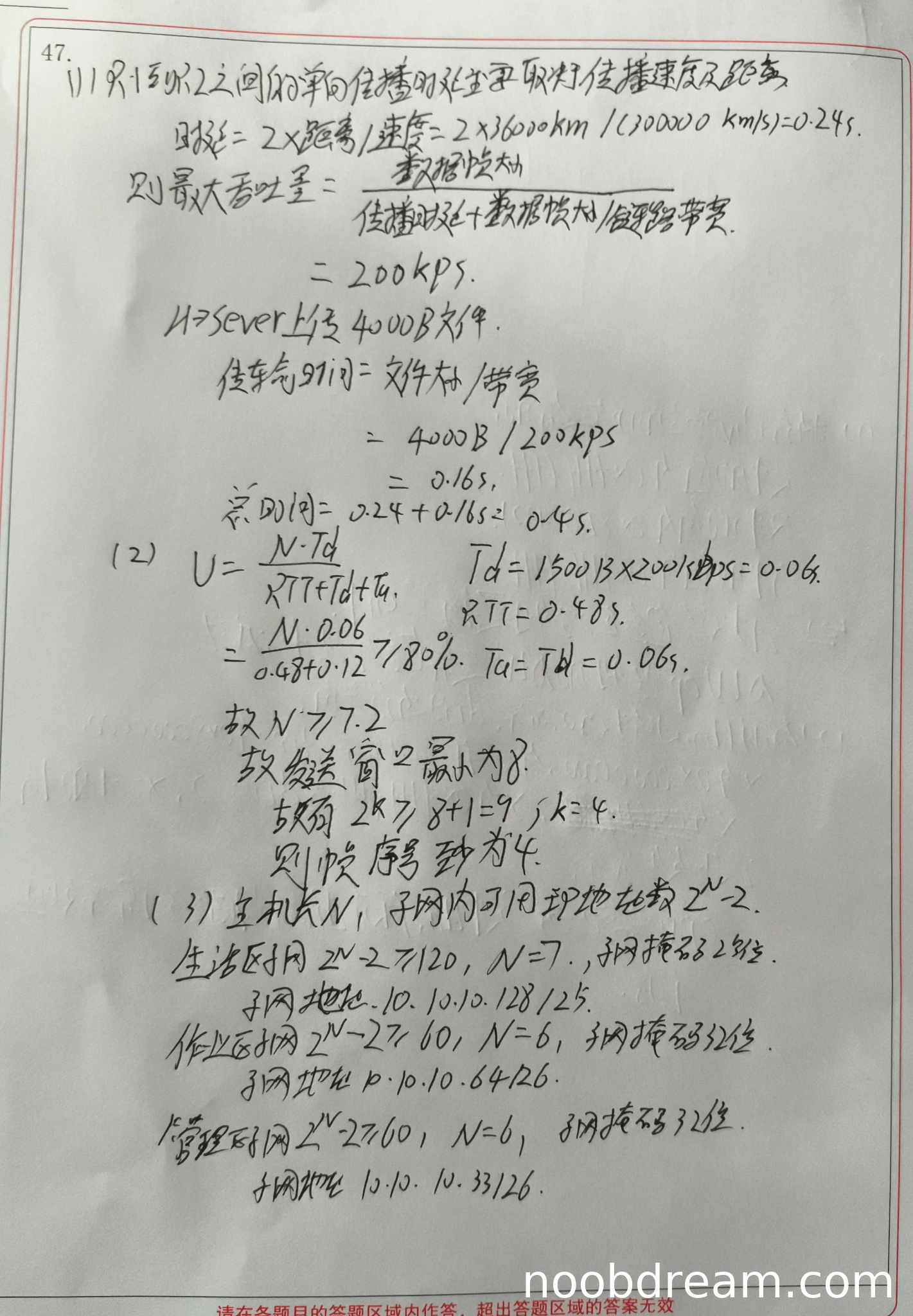 学生答案中单向传播时延计算为0.24s(即240ms),与标准答案一致;最大吞吐量给出200 kbps(或200 kb/s),正确;传输4000B文件总时间计算为0.4s(即400ms),与标准答案一致。虽然部分表述(如“数据帧长/(传播时延 + 数据帧长/信道带宽)”用于吞吐量计算)不够准确,但核心计算结果正确,且未影响最终答案。因此得3分。
