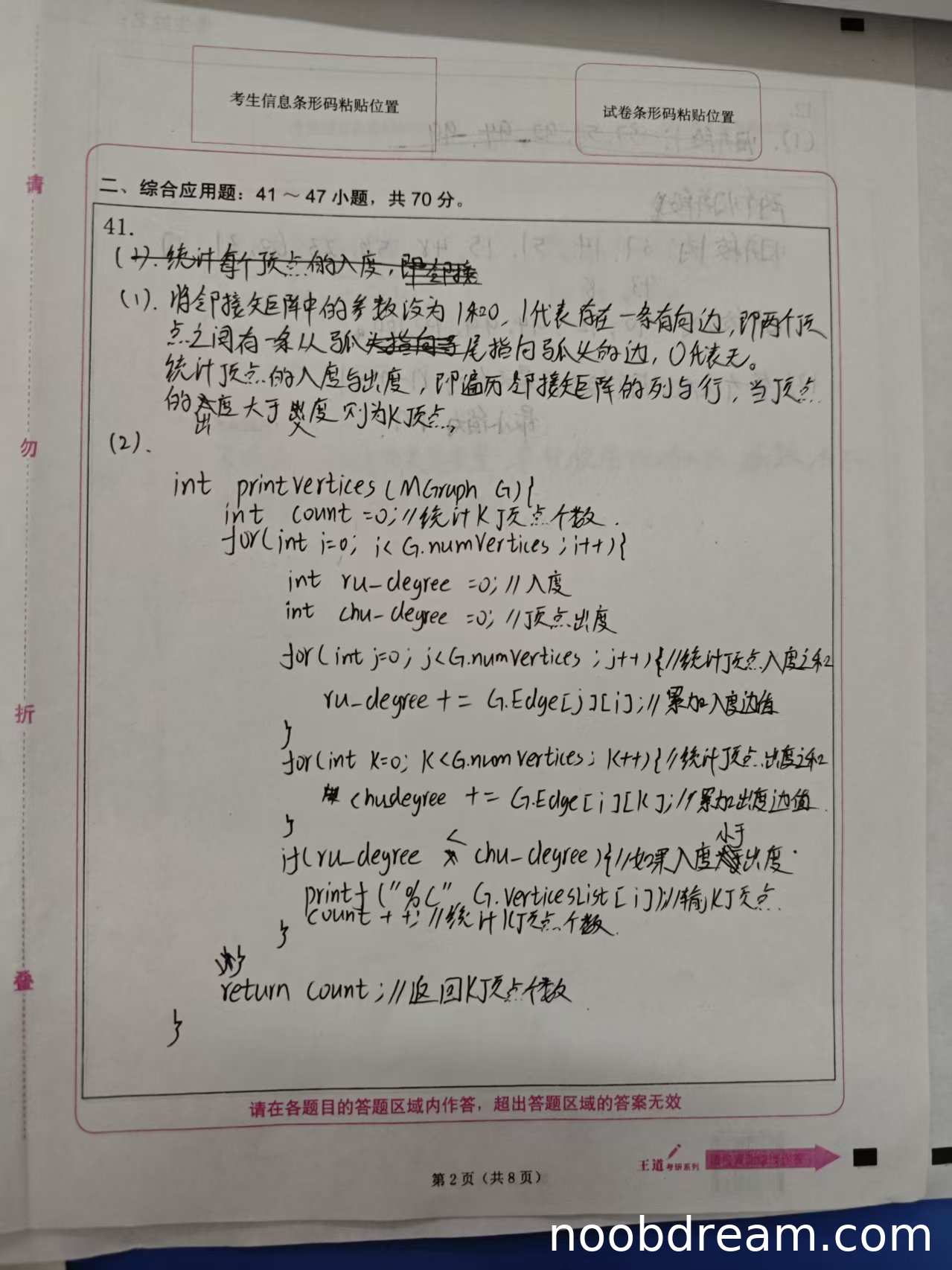 学生作答中,第1次识别结果对K顶点的定义描述有误(“当顶点的入度大于出度则为K顶点”),但第2次识别结果已修正为“当顶点的出度大于入度则为K顶点”,符合题目定义。整体设计思想清晰:通过遍历邻接矩阵分别计算每个顶点的入度和出度,比较后输出符合条件的顶点。思路与标准答案一致,不扣分。得4分。