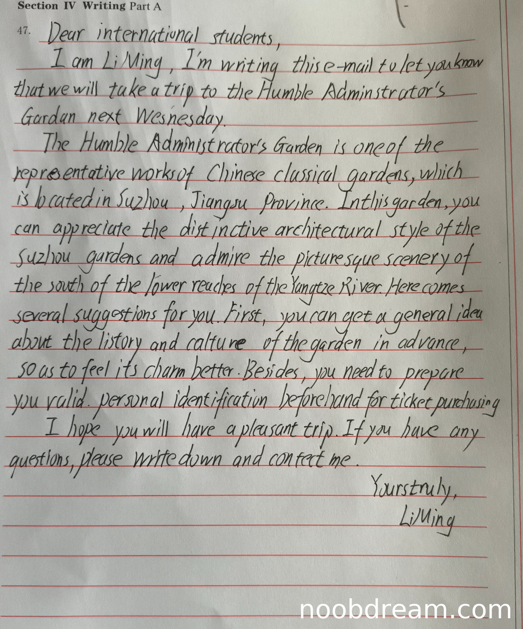 - 格式与语域:格式完全正确,包含称呼、正文、结束语和署名。语域恰当,作为组织者写给国际学生的邮件,语气友好、正式且得体。