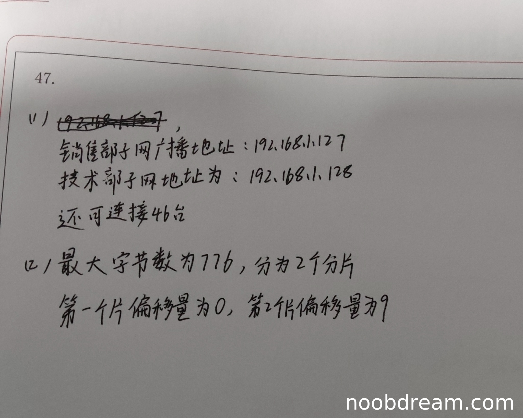 第一问:销售部子网广播地址为192.168.1.127,回答正确,得1分。