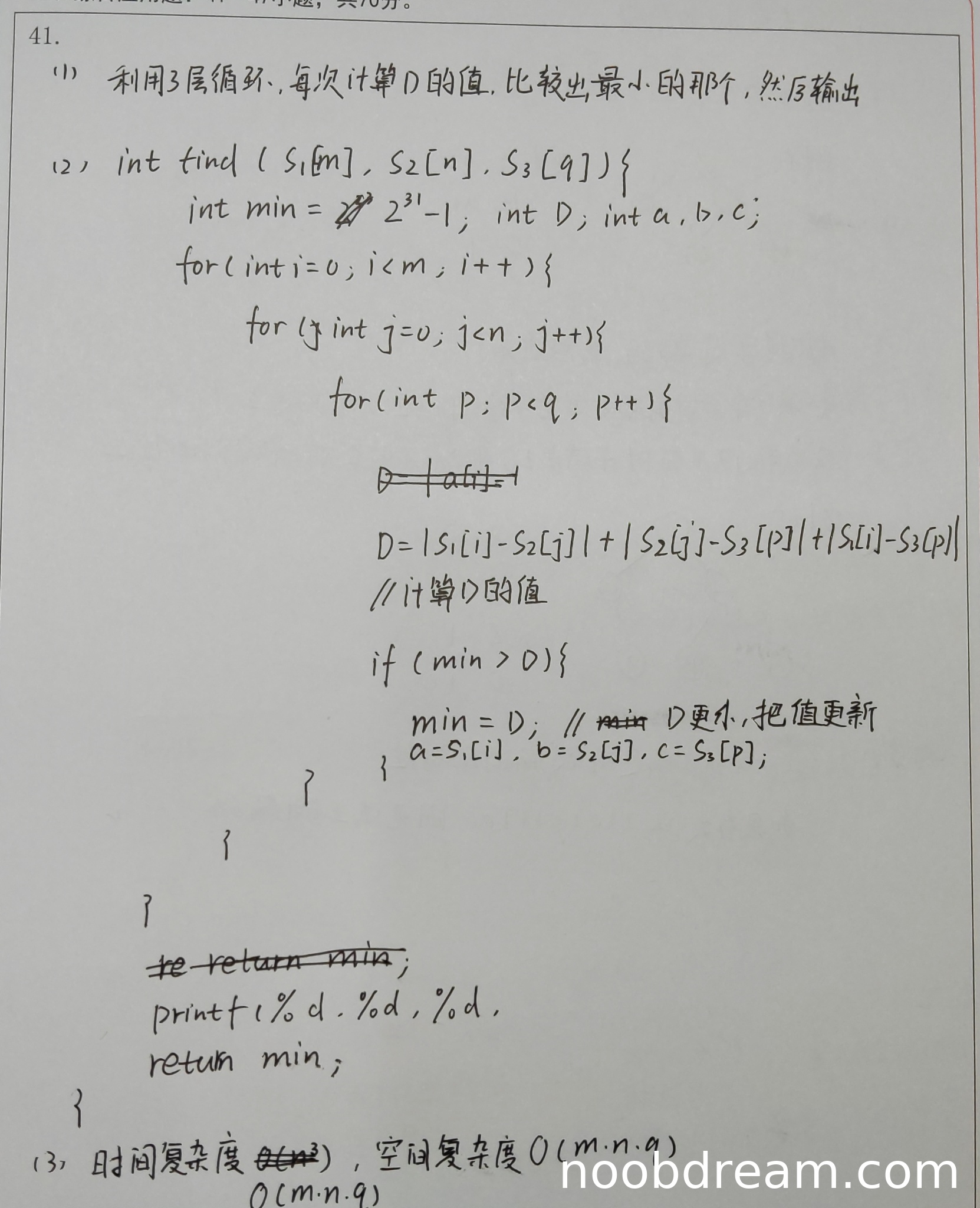 学生分析时间复杂度为O(m*n*q),这是正确的。但空间复杂度分析为O(m*n*q)是错误的。该算法只使用了常数个额外变量(min, D, a, b, c, i, j, p等),空间复杂度应为O(1)。因此扣1分。得1分。
