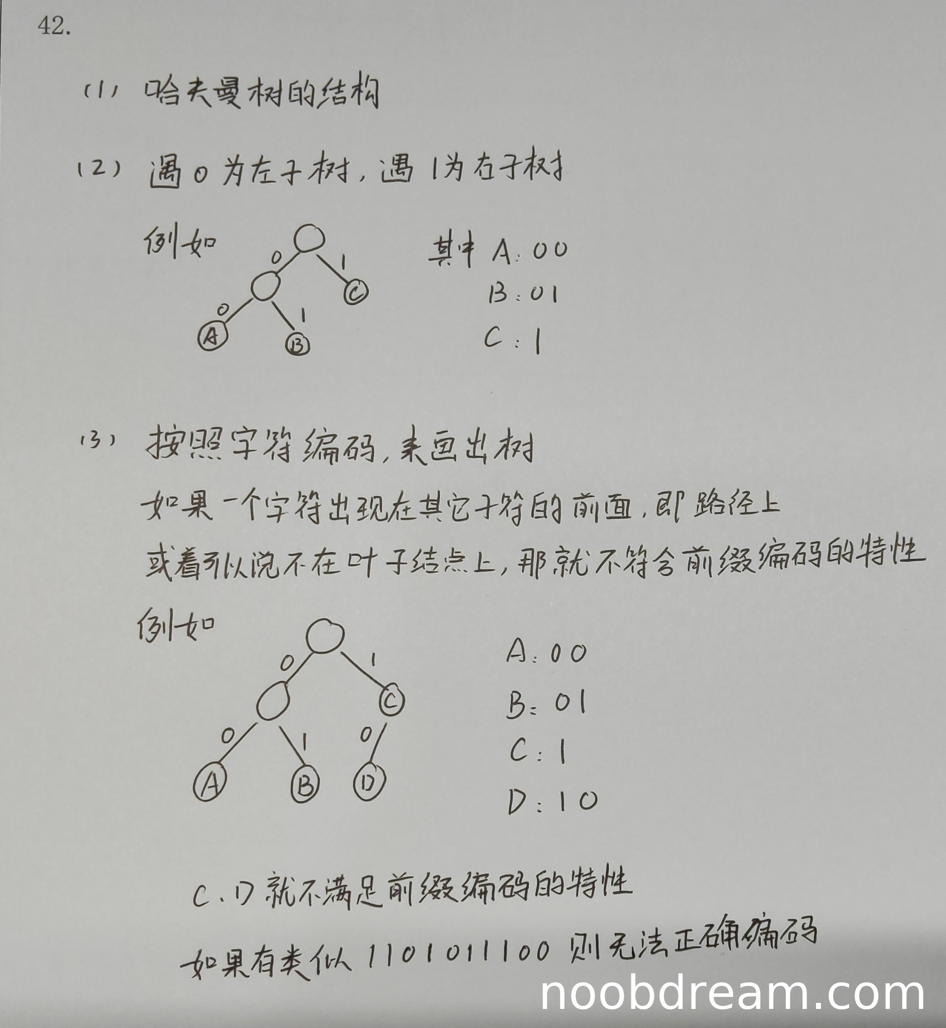 学生回答“哈夫曼树的结构”。标准答案指出可以使用哈夫曼树或前缀无关编码对应的二叉树。哈夫曼树是满足前缀特性的二叉树的一种典型应用,且其结构(字符在叶结点)能很好地保存这种编码。因此,该回答正确且符合题意。得4分。