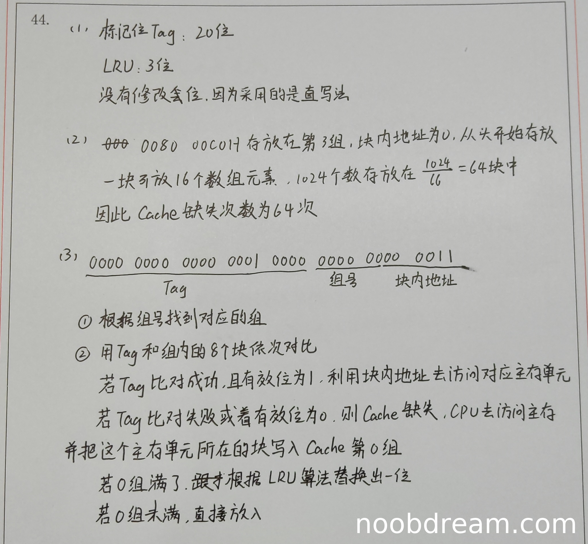 学生答案正确指出了标记位为20位,LRU位为3位,且没有修改位(因为采用直写策略)。与标准答案完全一致。