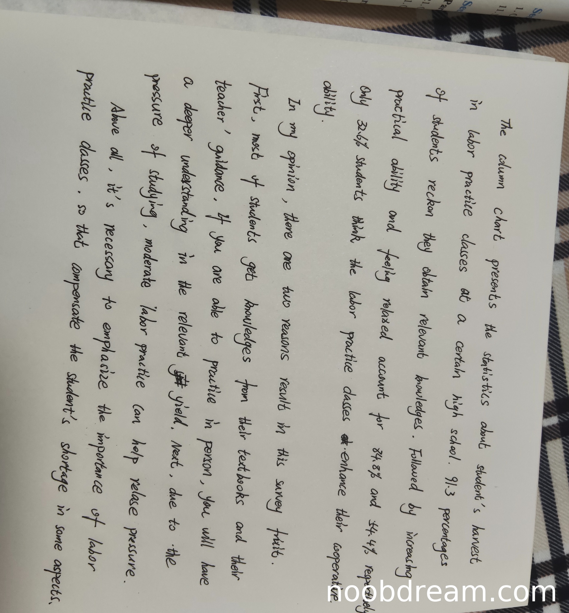该生作文基本完成了试题规定的任务。文章第一段描述了图表的主要内容,包含了四个关键数据点(尽管在两次识别中,部分数据有出入,如84.3%与84.8%,33.6%与25.6%,但根据“误写不扣分”原则,不因此扣分)。第二段给出了评论,分析了原因并总结了劳动实践课的重要性。文章结构清晰,包含了描述和评论两个部分。