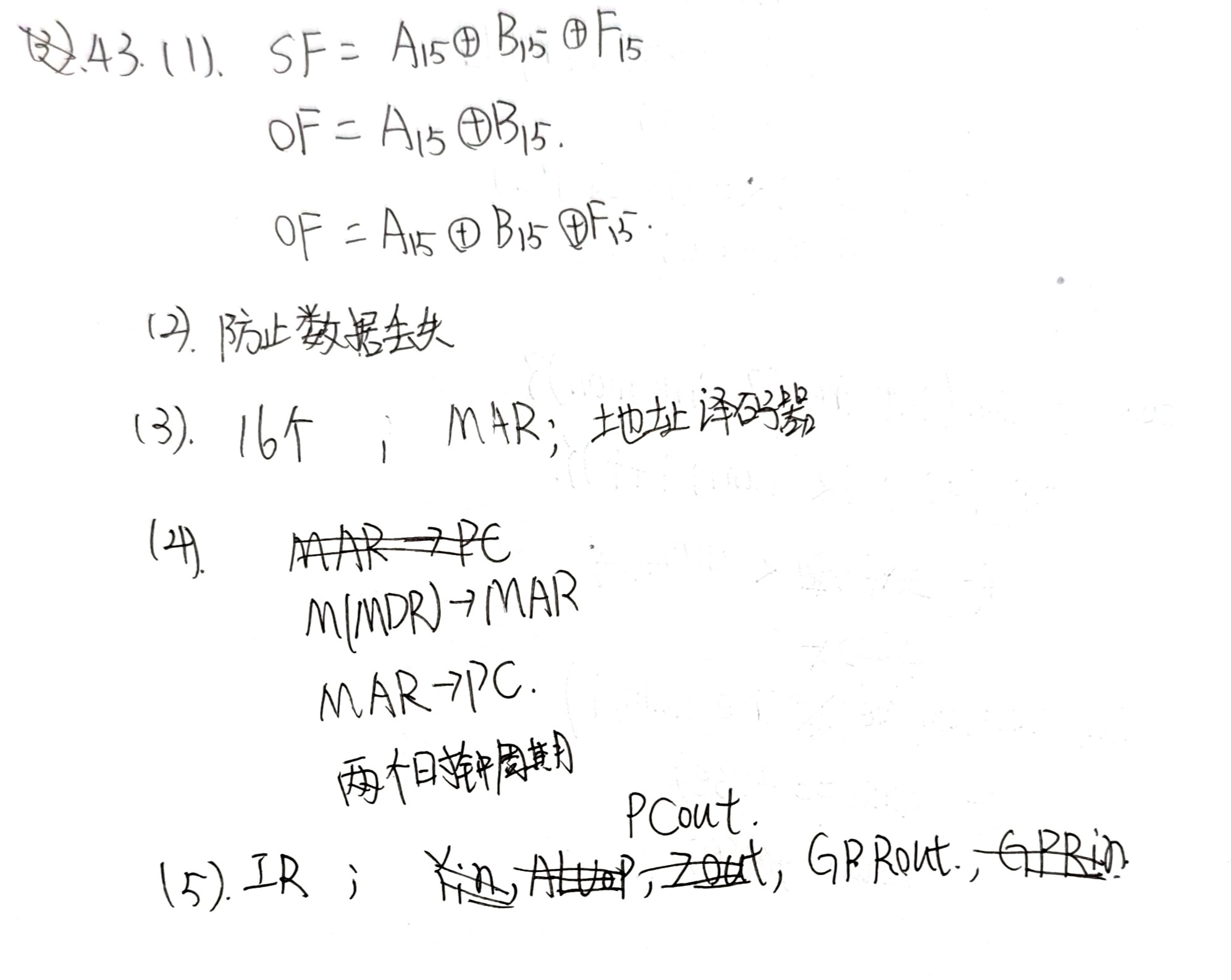 - 第一个OF表达式 \(OF = A_{15}\oplus B_{15}\) 错误,未区分加、减运算且未考虑F15。