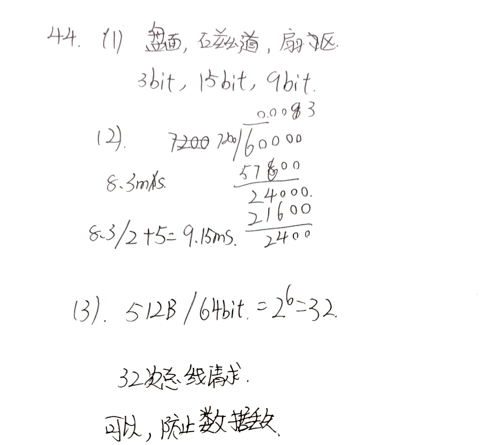 学生计算过程不完整,未明确列出平均寻道时间、平均延迟时间和传输时间,且计算过程有误(如“8.3m/s”单位错误,应为“ms”)。但其最终结果“9.15ms”与标准答案“9.183ms”非常接近,可以认为是计算过程中的近似或笔误。考虑到核心思路(平均访问时间包含寻道、旋转延迟和传输)正确,且最终结果基本正确,本小题得2分。
