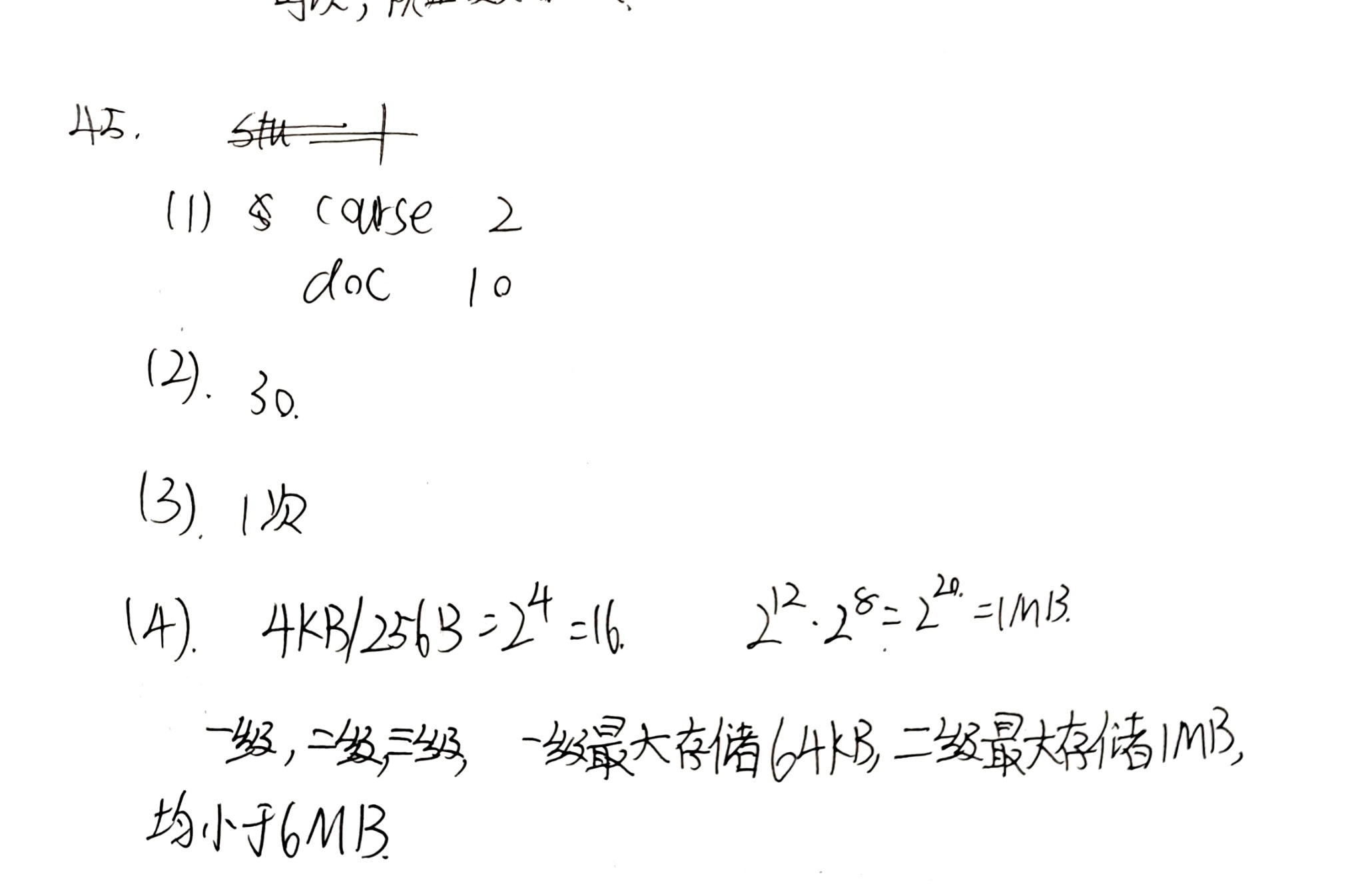 学生答案的计算过程和结论存在多处错误。首先,计算中出现了“4KB/256B = 16”等与解题无关或错误的内容。其次,给出的“一级最大存储64KB,二级最大存储1MB”的结论是错误的(根据题目参数,一级间接最大可寻址4KB * 1024 = 4MB,二级间接最大可寻址4MB * 1024 = 4GB)。最后,学生得出的结论“均小于6MB”虽然正确,但基于错误的前提和计算,且未能明确指出需要用到哪几级间接地址项(标准答案为“一级和二级间接地址项”)。因此,本题存在核心逻辑错误,得0分。