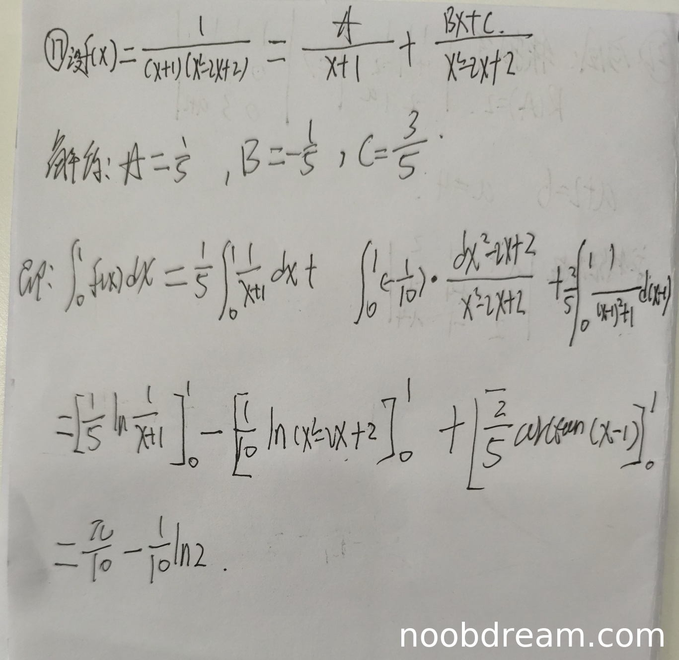- 第三步:代入上下限计算,但最终结果 \(\frac{\pi}{10}-\frac{1}{10}\ln2\) 与正确答案 \(\frac{3}{10}\ln2 + \frac{1}{10}\pi\) 不符,主要因为系数错误和对数部分计算错误。