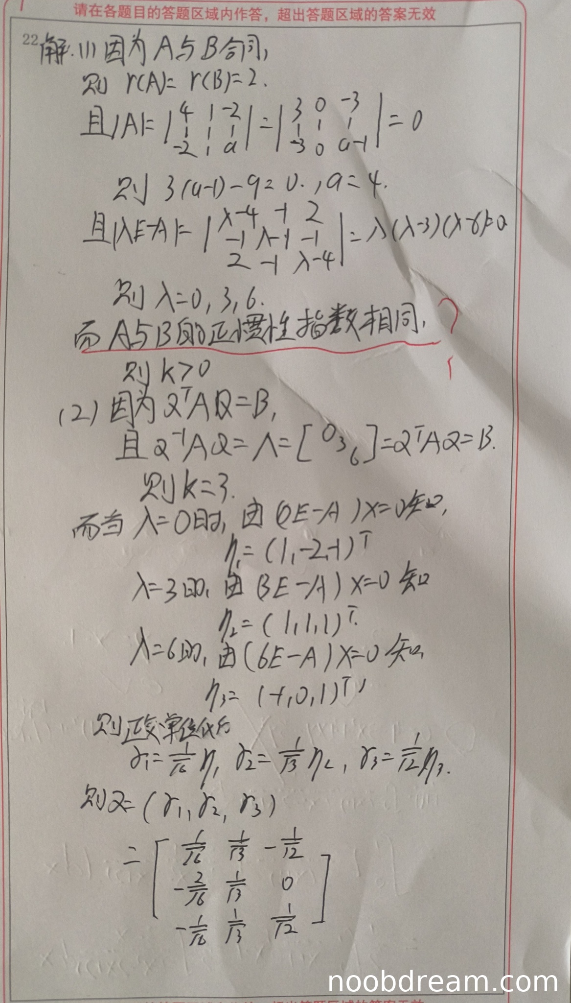 学生由 Q^T A Q = B 且 Q 正交推出 A 与 B 相似,从而 k 必须为 3,正确。求特征向量时,第一次识别中 λ=6 的特征向量为 (-1,0,1)^T,第二次识别中写成了 (1,0,1)^T,这是严重错误,因为 (1,0,1)^T 不是 λ=6 的特征向量(代入验证可知不对)。但第一次识别结果是正确的,根据“只要其中有一次回答正确则不扣分”的原则,这里以第一次识别为准,不扣分。单位化时,学生将三个特征向量单位化后组成 Q,但顺序与标准答案不同:标准答案中 Q 的列是按特征值 3,6,0 对应的单位特征向量排列,而学生是按 0,3,6 排列,这会导致 Q^T A Q = diag(0,3,6) 而不是 diag(k,6,0),但题目中 B 是 diag(k,6,0),所以必须对应好顺序。学生没有调整顺序,直接按 0,3,6 排列,得到的 Q 会使 Q^T A Q = diag(0,3,6),与 B 不一致(除非 k=3 且交换顺序),因此 Q 的构造有误。扣 2 分。此外,第二次识别中 γ3 对应的 ξ3 写错,但以第一次识别为准,不扣分。其余步骤正确。得 4 分。