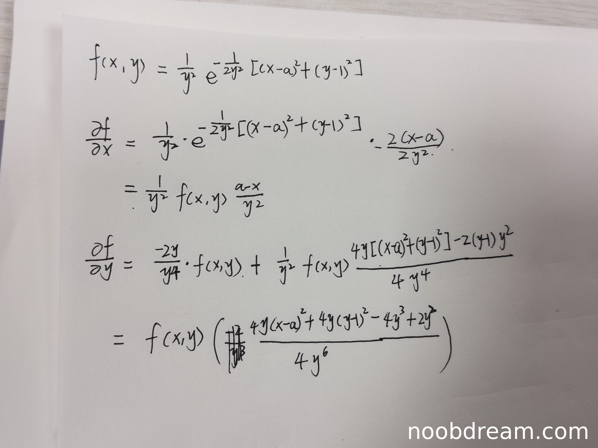 学生的作答内容仅为求函数的一阶偏导数 \(\frac{\partial f}{\partial x}\) 和 \(\frac{\partial f}{\partial y}\),并未完成后续的寻找驻点、计算二阶偏导及判断极值等核心步骤。因此,该解答过程不完整,只完成了整个解题流程的初始部分。