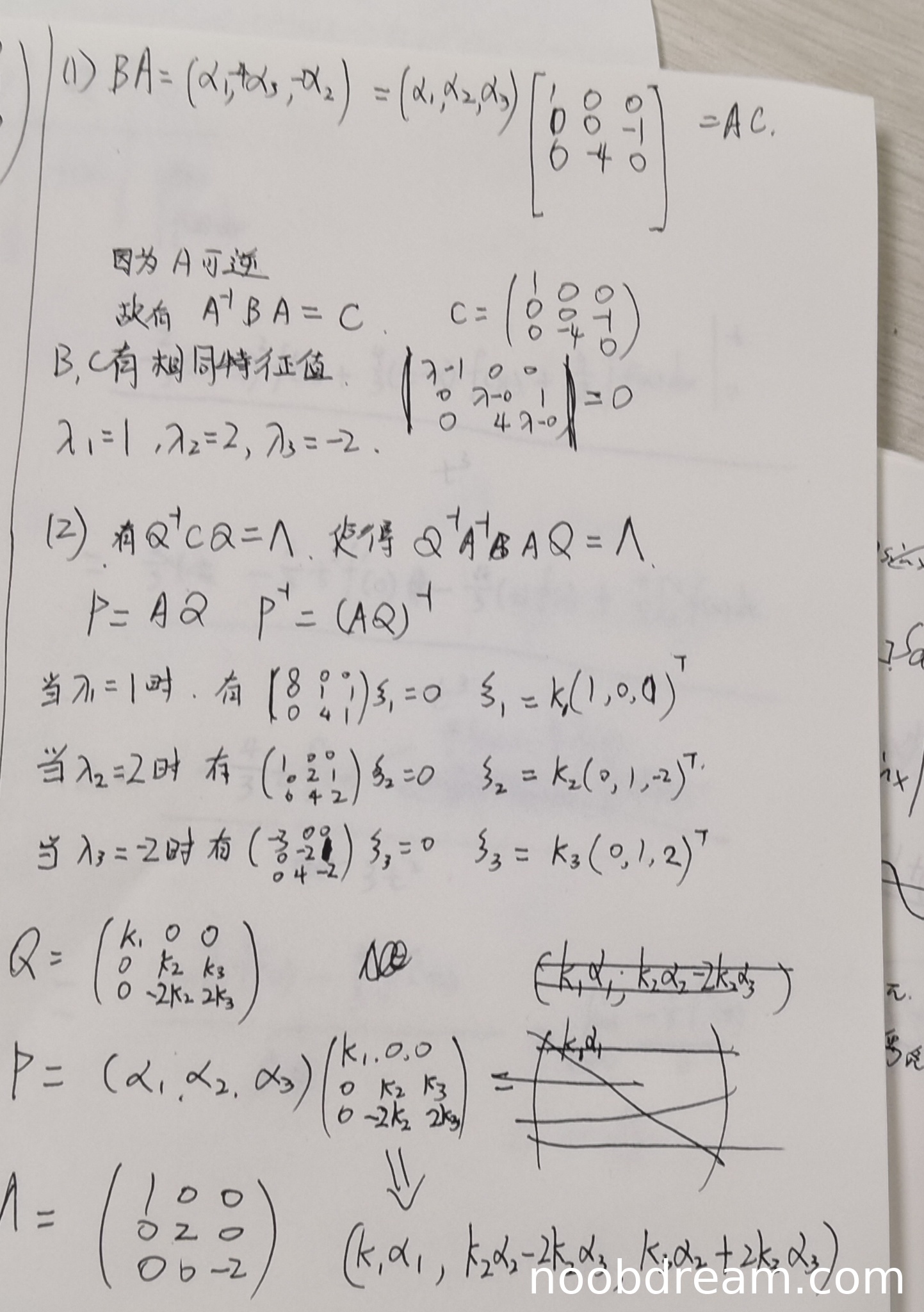 3. 尽管最终P的表达式形式与标准答案相似(含参数k1,k2,k3),但由于特征向量求解过程有误且Q矩阵构造不正确,导致结果不准确。