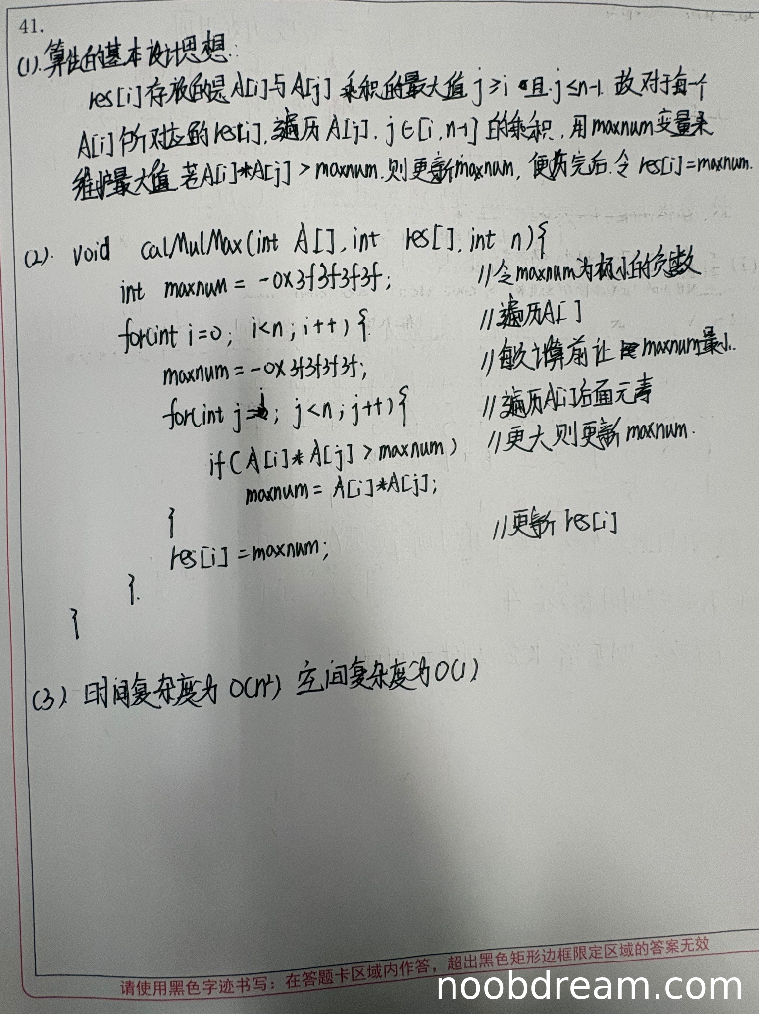 理由:学生的基本设计思想是暴力枚举法,即对每个A[i],遍历所有j≥i的A[j]计算乘积并取最大值。这个思路是正确且能解决问题的,但不符合题目“时间和空间上尽可能高效”的要求。标准答案给出了O(n)时间复杂度的更优解法。因此,学生的思路虽然正确,但效率较低,不能得满分。考虑到其思想描述清晰,扣2分。