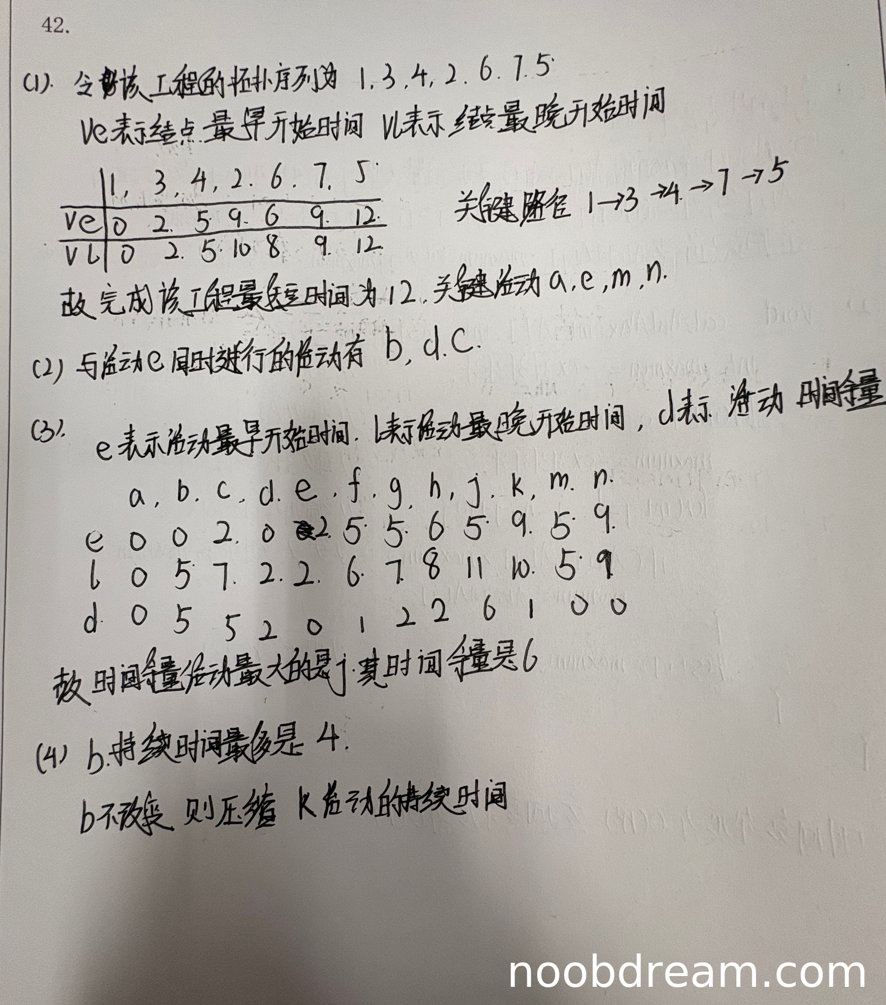 学生答案:最短时间为12,关键活动a、e、m、n。
