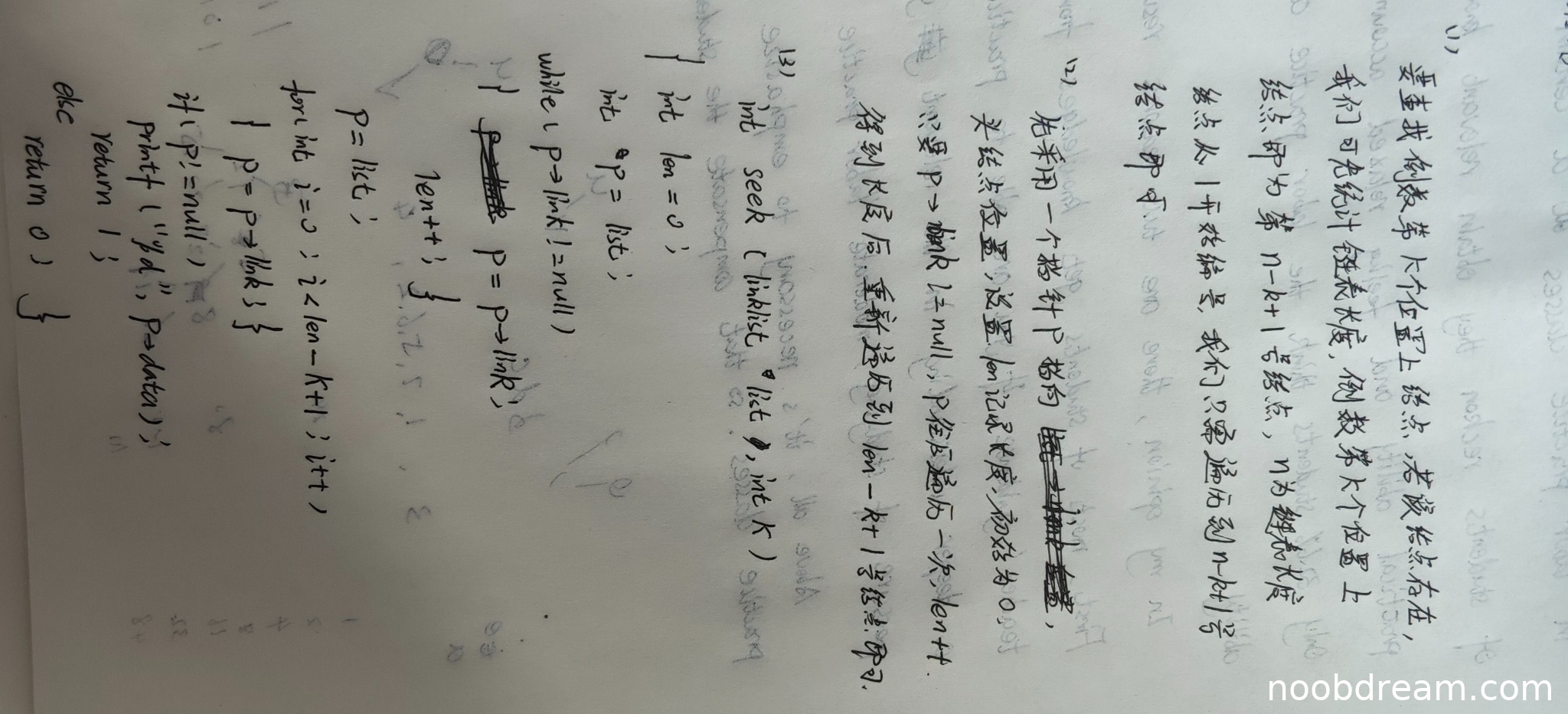 seek,参数为linklist *list;第2次识别中参数为LinkNode *linklist。这里假设以第2次识别为准,但第2次识别代码中,函数返回的是结点的data值,而题目要求成功时“输出该结点的 data 域的值,并返回 1”,失败时“只返回 0”。学生的代码成功时返回了数据值,失败时返回0,这不符合题目“返回1”的要求,这是一个逻辑错误。for (int i = 0; i < len - k; i++)中,当k等于len时(即查找倒数第len个,即第一个结点),循环次数为0,定位正确。但当k > len时,len - k为负数,循环条件i < 负数不成立,循环不会执行,p仍指向头结点,最后if (p != NULL)条件成立,会错误地返回头结点的数据(可能是无效值)。正确的做法是在统计长度后,应先判断if (k <= 0 || k > len) return 0;。这是一个重要的逻辑缺陷。linklist被直接当作第一个数据结点开始遍历,忽略了表头结点。这会导致长度统计和定位的起始点错误。