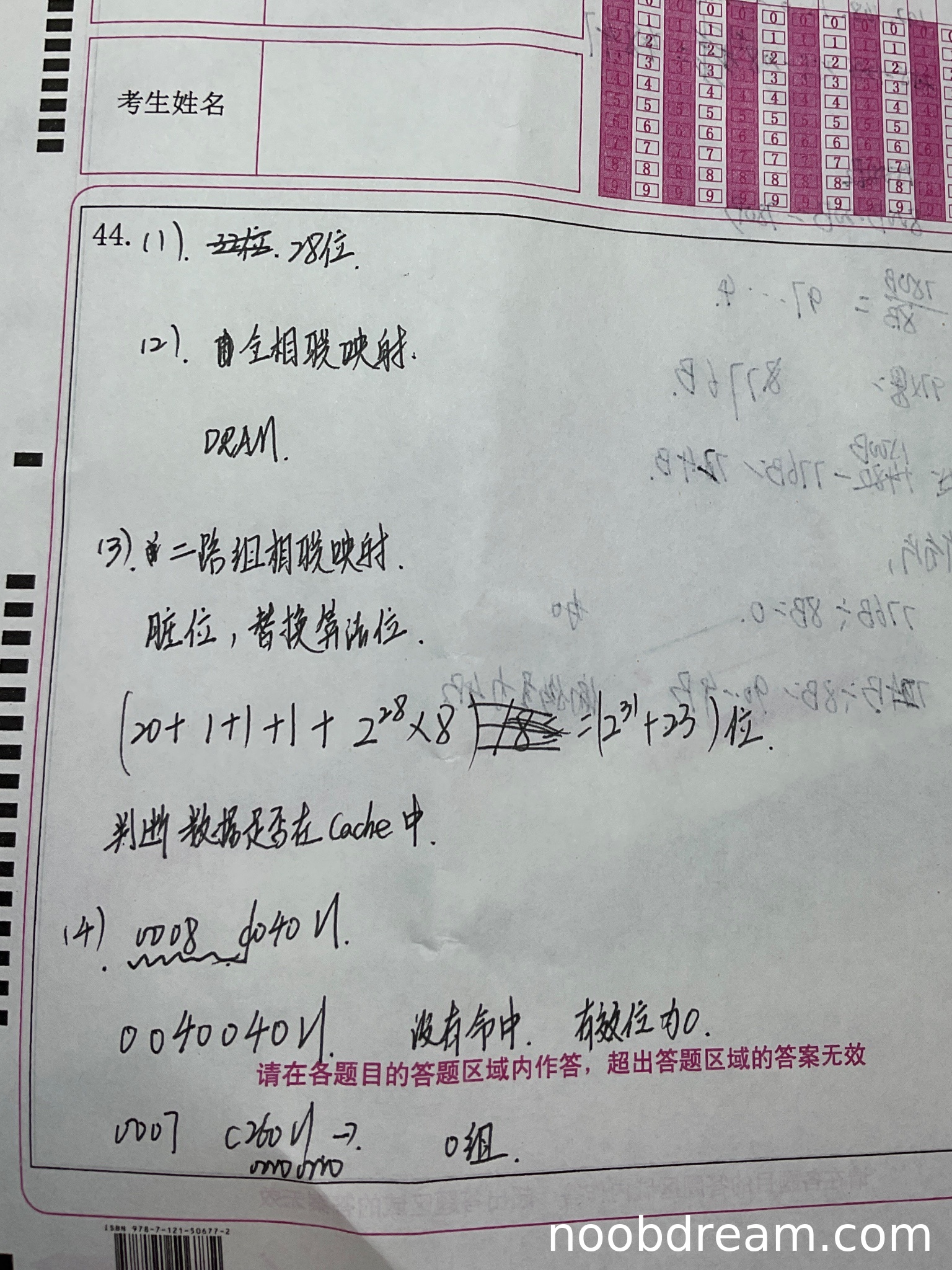 第二问:学生两次识别均回答“DRAM”,而标准答案为SRAM。这是一个核心知识点的错误。TLB作为页表的高速缓存,要求访问速度快,通常由SRAM实现,而非DRAM。此错误属于逻辑错误,应扣分。得0分。