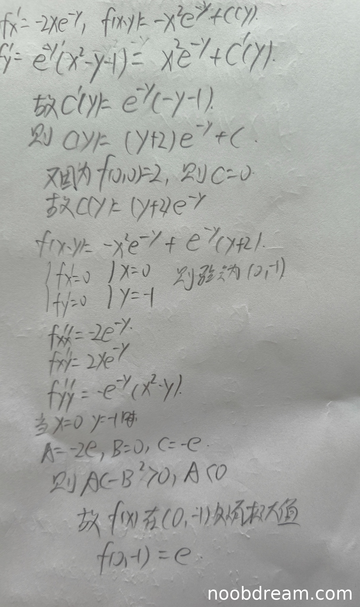扣分情况:在第一次识别结果中,最终写出的函数为 \( f(x,y) = -x^2 e^{-y} + e^{-y}(x+2) \),此处应为 \( e^{-y}(y+2) \),多了一个 \( x \) 而少了 \( y \),属于明显的表达式错误(不是简单的字符误写,而是结构错误),导致函数形式不正确。第二次识别结果中同样出现了 \( f(x,y) = -x^2 e^{-y} + e^{-y}(x+2) \) 的错误。