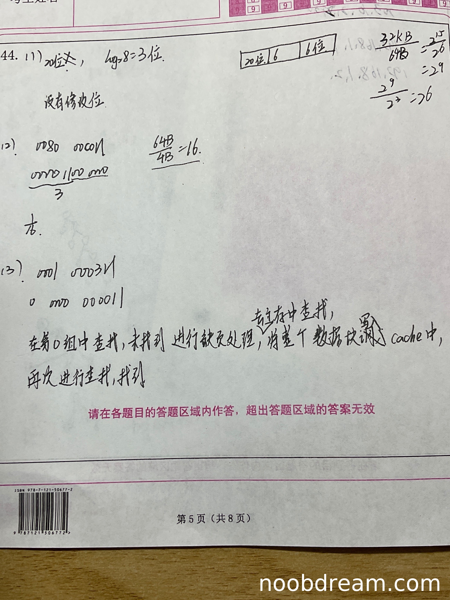 学生答案描述了基本过程:根据地址映射到第0组,未找到(缺失),然后将整个数据块调入Cache,再次查找找到。这个过程是正确的。但答案中存在术语错误,将“缺失处理”误写为“缺页处理”(这是操作系统中的概念,Cache缺失应称为“缺失处理”或“块调入”)。根据“禁止扣分”原则,这可能是识别错误或笔误,且核心逻辑(映射、缺失、调块)正确,因此不扣分。答案未提及更新标记、有效位和LRU位等细节,但题目要求“简要说明”,核心步骤已涵盖。因此,本题得4分。