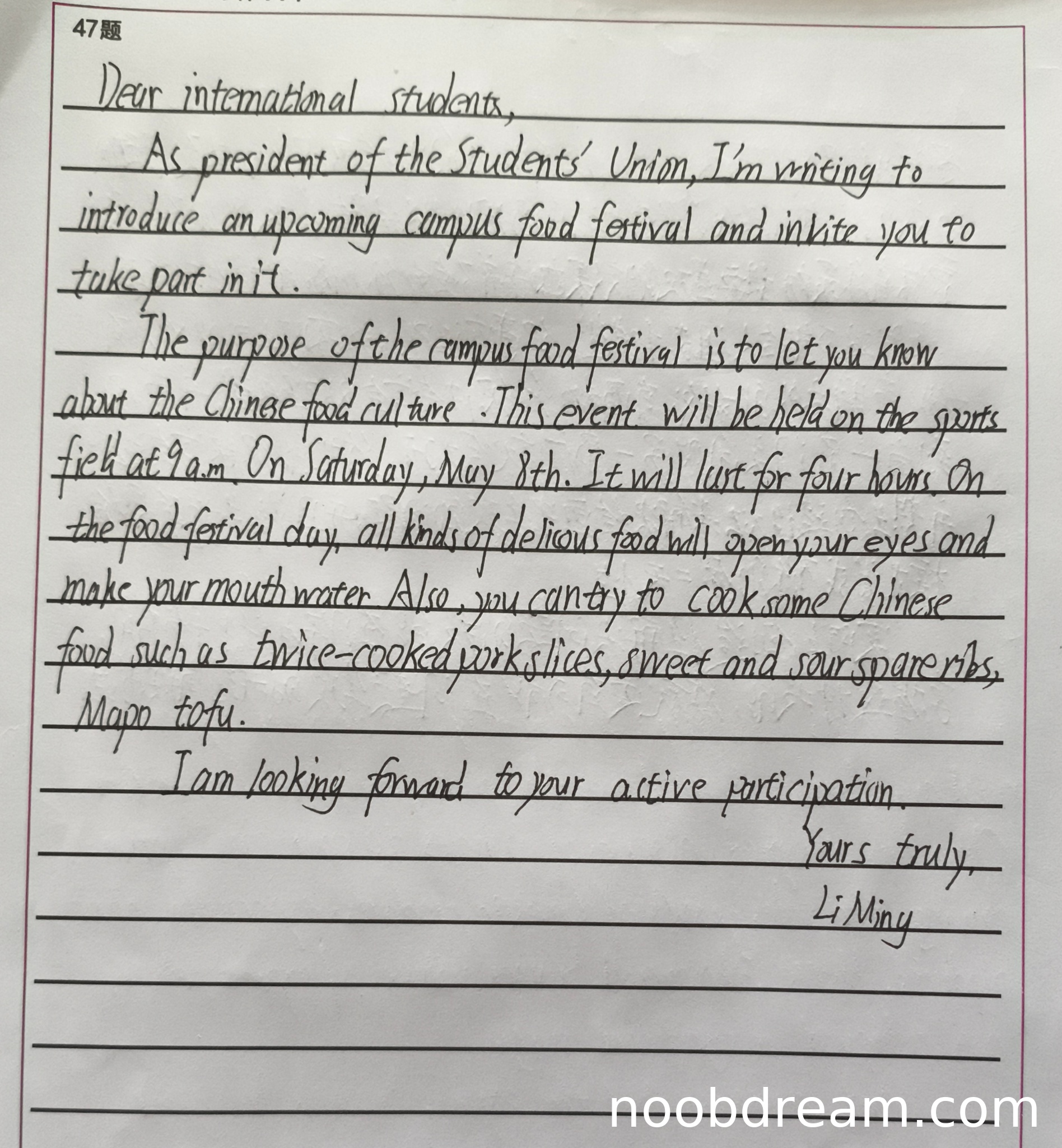 该学生作答是一封完整的电子邮件,内容覆盖了题目要求的两个要点:1) 介绍美食节;2) 邀请国际学生参与。信件结构清晰,包含称呼、正文、结束语和署名,格式正确。语言流畅自然,语法和词汇错误极少(如“food - festival”中的空格可能是识别问题,不影响理解),语域恰当(作为学生会主席写给国际学生的正式邀请信)。逻辑清晰,从介绍目的、时间地点、活动内容到发出邀请,衔接紧密。因此,根据评分标准,该作答属于第五档(优秀),得分9-10分。考虑到其内容完整、语言准确、格式无误,给予满分10分。