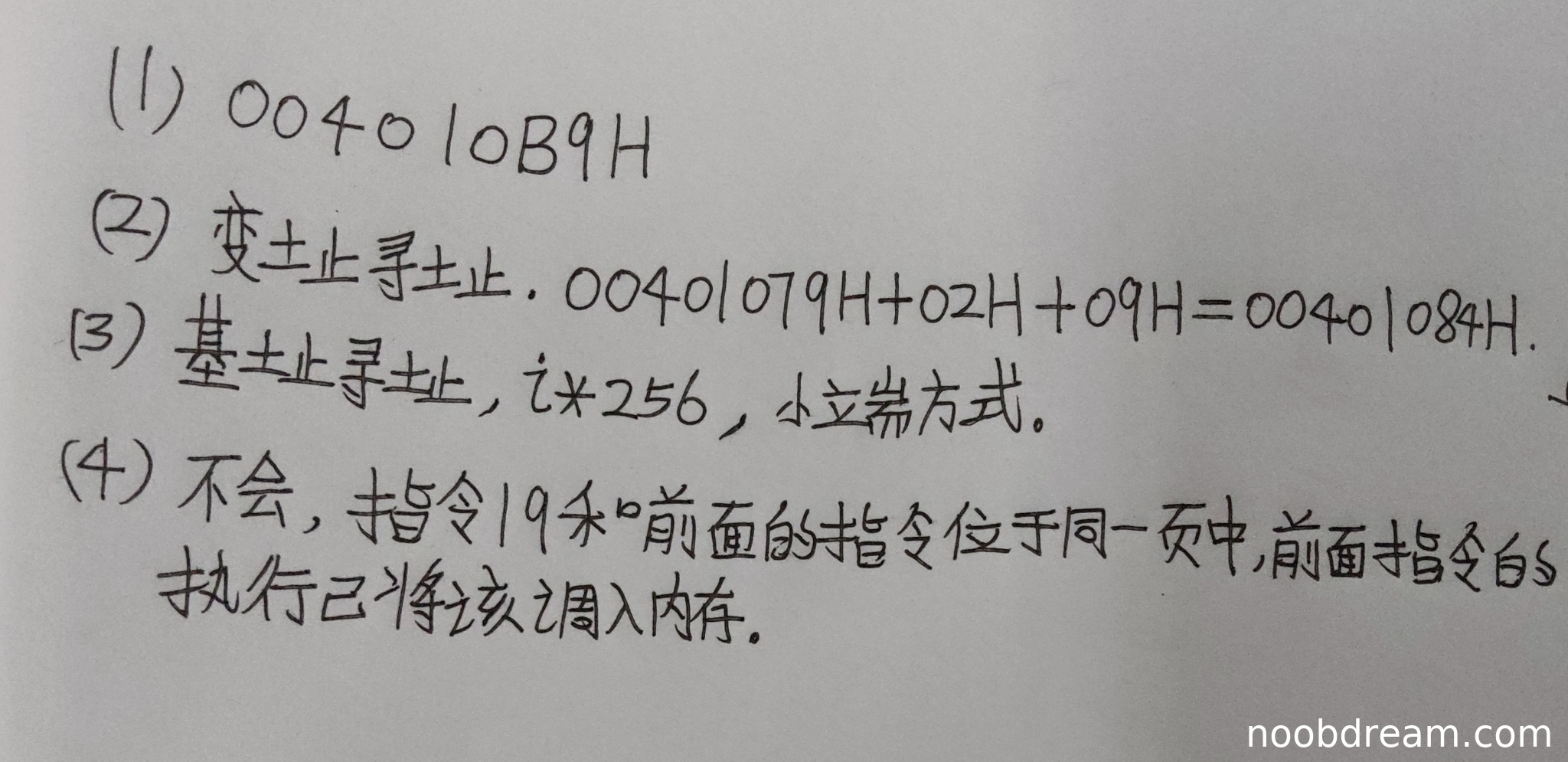 学生答案存在部分错误。第一问,标准答案为“立即寻址”,学生答为“基址寻址”,这是错误的。第二问,答案正确,ecx存放的是i×256。第三问,答案“小端方式”正确,但文字有误写(“小立端”或“小端”),根据规则,识别导致的误写不扣分。因此,第一问扣1分,第二问得1分,第三问得1分,本小题总计得2分。
