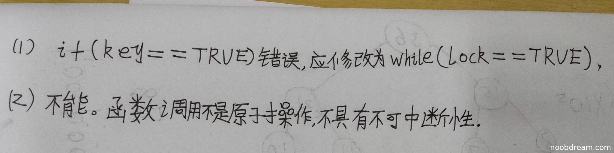 考虑到学生正确指出了第一处错误的核心在于将if改为while以实现轮询,尽管条件变量从key改为了lock,但其互斥逻辑在配合正确的退出区操作下也能实现(虽然与标准答案的轮询key的写法不同)。但因其未改正第二处错误,故扣分。第一问满分4分,扣2分。