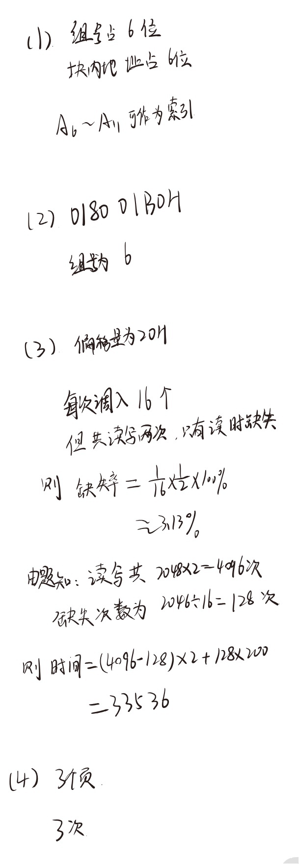 - 错误3:平均访问时间计算错误。学生计算了总时间“33536”个时钟周期,这并非所问的“平均访问时间”。题目要求的是“数组元素的平均访问时间”,应是一个每次访问的平均值。学生未给出正确的平均访问时间计算公式或结果。