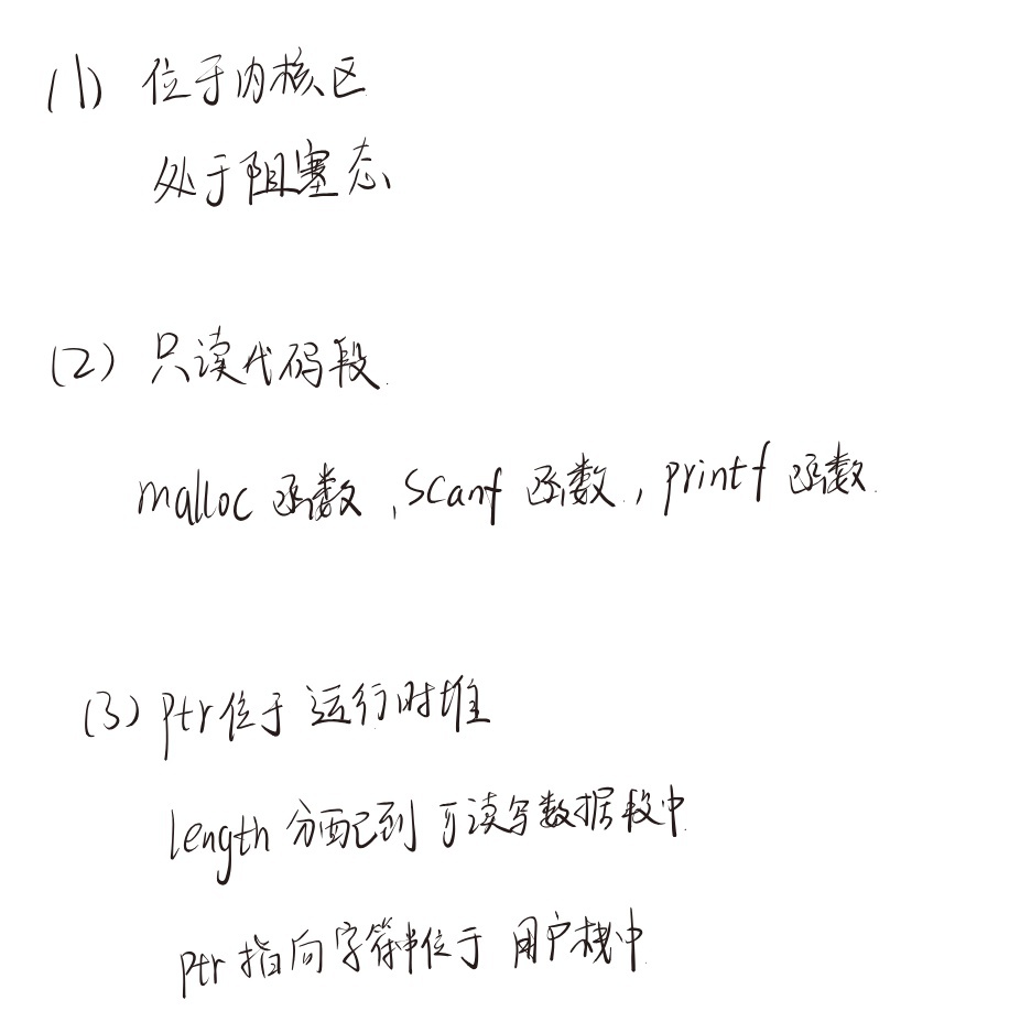 学生回答“ptr位于运行时堆”错误,ptr是全局变量,应位于可读写数据段,扣1分。“length分配到可读写数据段中”错误,length是局部变量,应位于用户栈,扣1分。“ptr指向字符串位于用户栈中”错误,ptr指向的字符串是malloc动态分配的,应位于堆区,扣1分。因此本小题得0分。