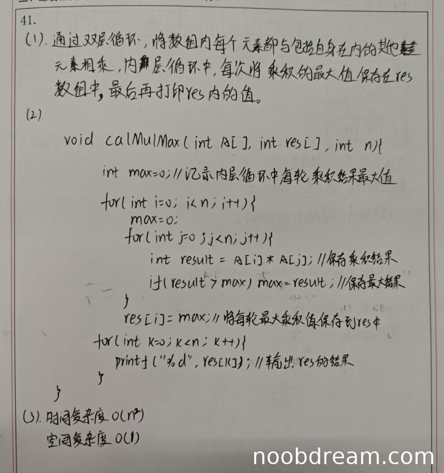 学生根据设计思想实现了双层循环的算法,代码逻辑正确,能够计算出每个A[i]与所有A[j]乘积的最大值。但存在以下问题:
