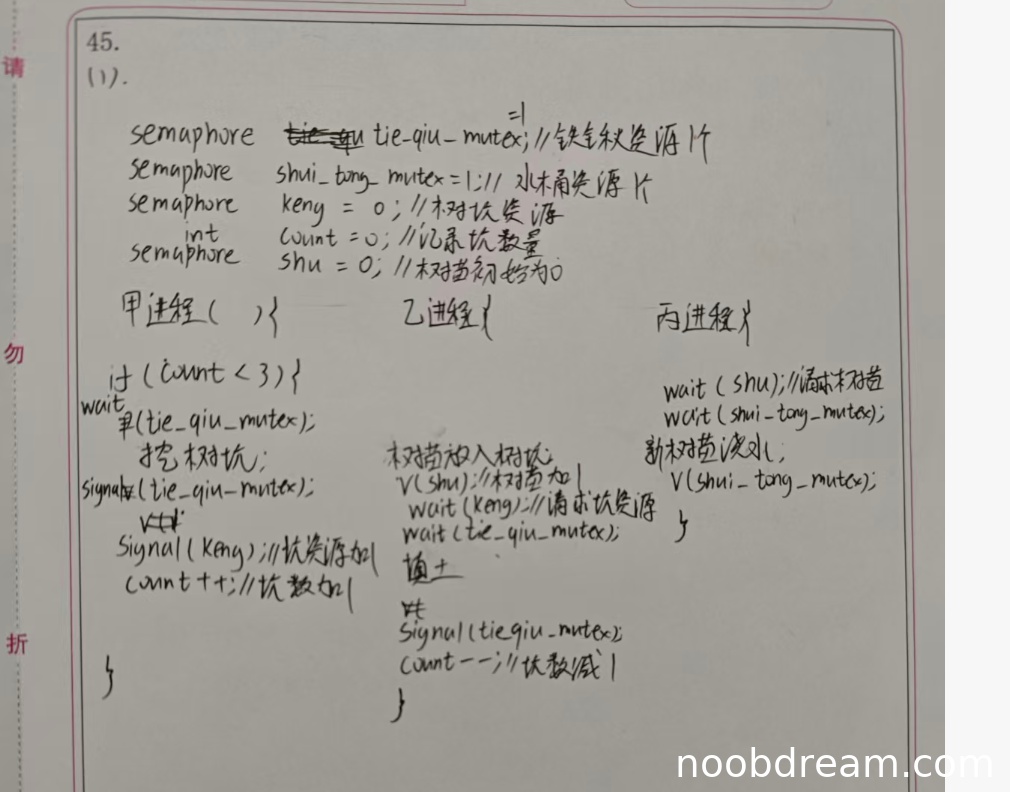 理由:代码基本完整,使用了wait/signal(或V)操作,但有部分语句不完整(如乙进程中“填+”可能是识别错误),且信号量名称存在拼写不一致(如tie-qiu-mutex与tie_qiu_mutex混用),因属于识别问题不扣分,但整体逻辑错误较多,扣0.5分。