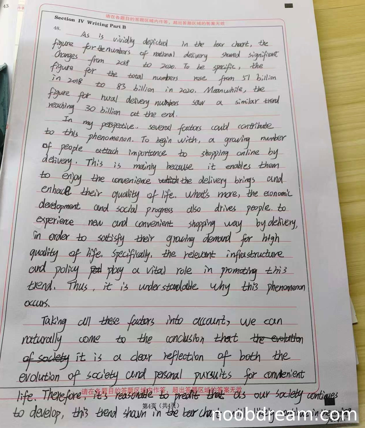 该生作文较好地完成了试题规定的任务。首先,文章准确描述了图表的核心信息:全国快递业务总量从2018年的510亿件(第一次识别为57,但第二次识别正确为51,以正确为准)增长到2020年的830亿件,农村快递业务量也呈现相似增长趋势,在2020年达到300亿件。这满足了“interpret the chart”的要求。其次,在评论部分,文章从人们日益重视网购、经济发展与社会进步、以及相关基础设施和政策的作用等方面进行了分析,逻辑清晰,内容完整。语言方面,使用了较丰富的语法结构(如非限定性定语从句、名词性从句等)和词汇(如attach importance to, play a vital role, evolution等),衔接手法得当(如To begin with, What's more, Thus, Therefore),层次分明。格式与语域(议论文)恰当。虽然存在个别小错误(如第二次识别结果中“the evolution of society it is a clear reflection”有重复,可视为识别错误或笔误;以及“drives”应为“drive”),但整体语言流畅,不影响理解。根据评分标准,此文属于第二档(10-12分)的上限,接近第一档。综合考虑其内容完整性和语言质量,给予12分。