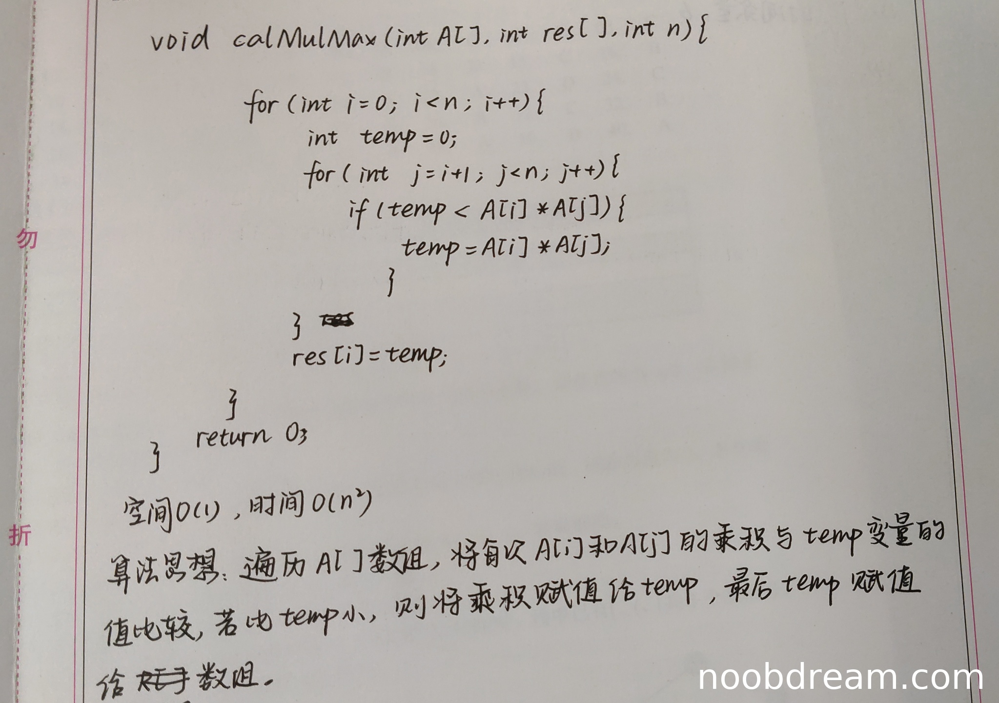 学生给出的算法思想是:对每个A[i],遍历其后的所有A[j](j>i),计算乘积并保留最大值,最终存入res[i]。这一思路能够正确计算出题目要求的结果(即对于每个i,找到j≥i时A[i]*A[j]的最大值)。虽然算法的时间复杂度不是最优(标准答案给出了O(n)的解法),但题目要求“尽可能高效”,并未强制要求线性复杂度,且该思路正确实现了功能,因此不扣分。得4分。