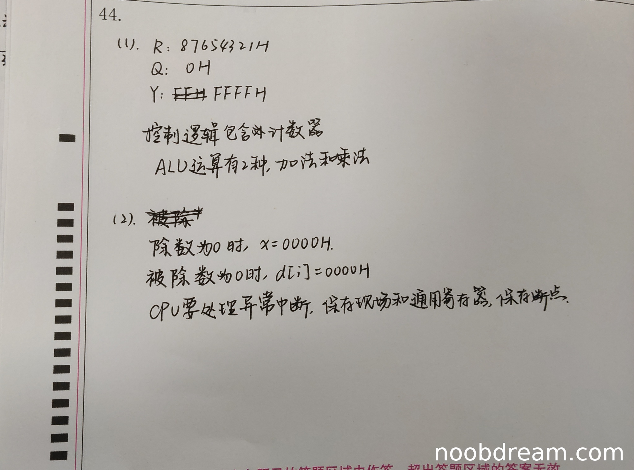 - Q初始内容:学生答“0H”,标准答案为“0x87654321”。Q应存放被除数的低32位,即d[i]本身(0x87654321)。学生错误地认为Q初始为0,逻辑错误,扣2分。