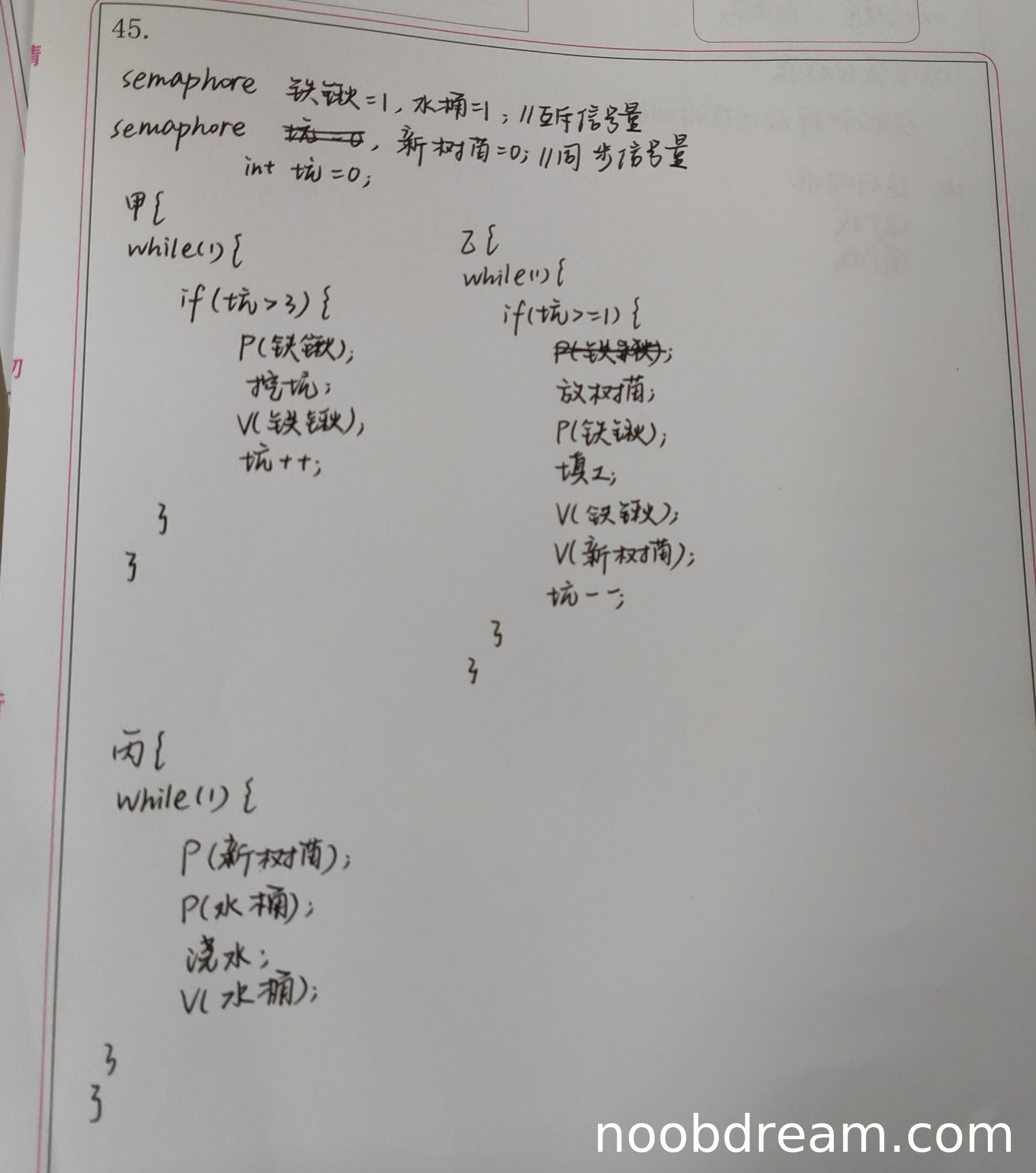2. 乙进程:逻辑问题严重。首先,判断条件if(坑>=1)可以接受,表示有坑可用。但执行流程中,在“放树苗”和“填土”之间又进行了一次P(铁锹),这会导致死锁,因为此时铁锹信号量已被乙进程持有,再次P操作会导致阻塞。此外,对“坑--”的操作同样未受保护。