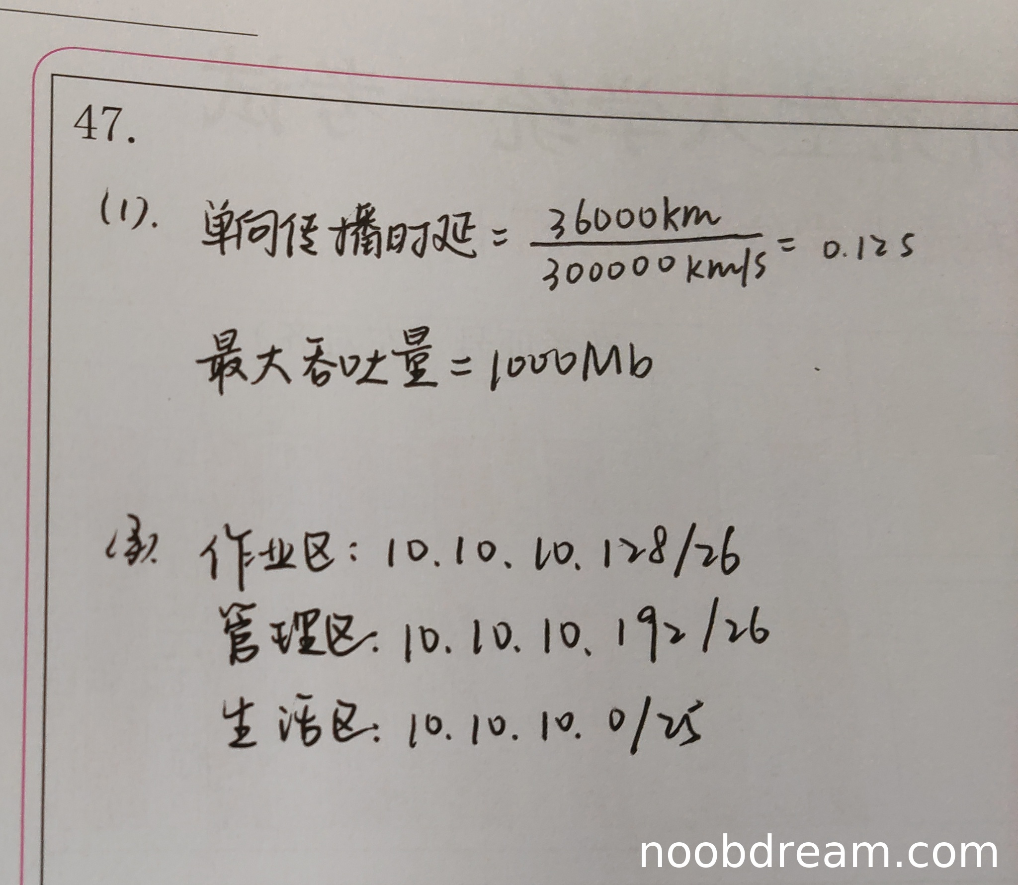2. 最大吞吐量错误。卫星链路每个方向速率为200kb/s,学生给出的1000Mb或100Mb与链路速率不符,且单位错误(应为kb/s),属于逻辑错误。扣1分。