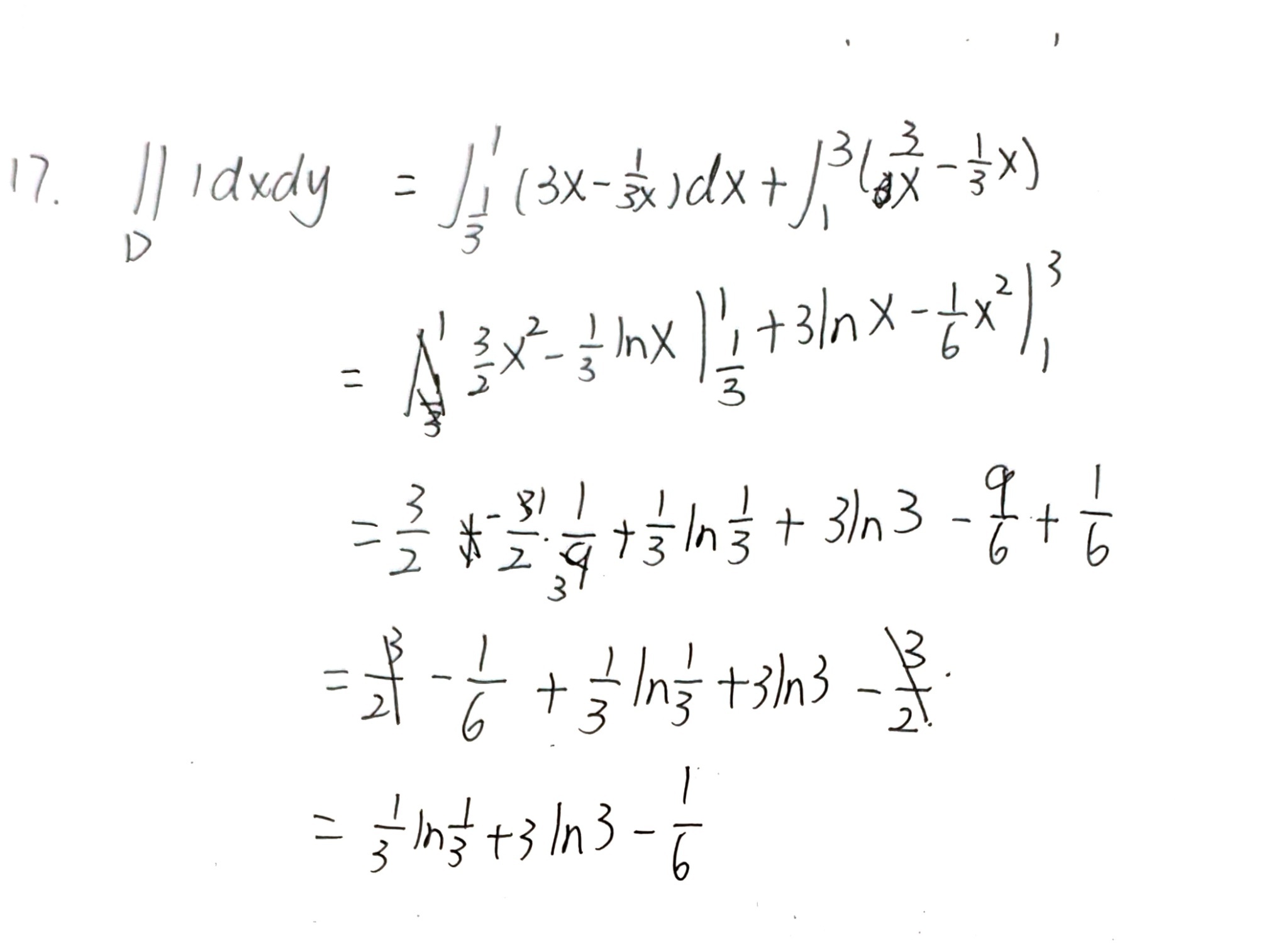 - 积分区域划分与计算:尽管学生后续对区域D的面积计算(即 \(\iint_{D} 1 dxdy\))在思路上(先对y积分后对x积分)是正确的,并且计算过程基本无误,但由于其出发点(被积函数)是错误的,因此这部分计算对于本题而言没有意义,不能给予分数。