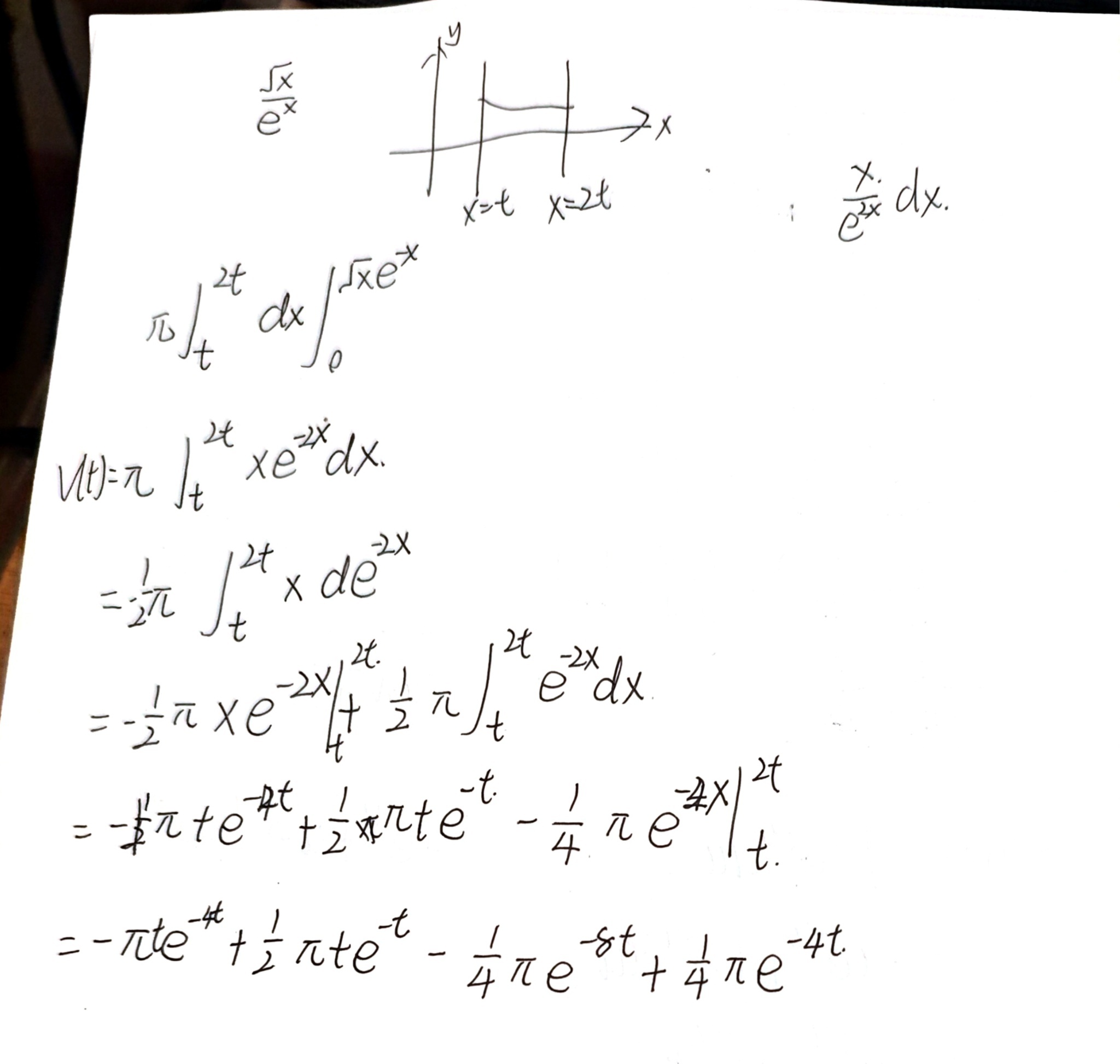 学生正确写出了旋转体体积公式 \( V(t) = \pi \int_{t}^{2t} x e^{-2x} \, dx \),并尝试用分部积分法计算该积分。但在积分过程中出现了多处错误:
