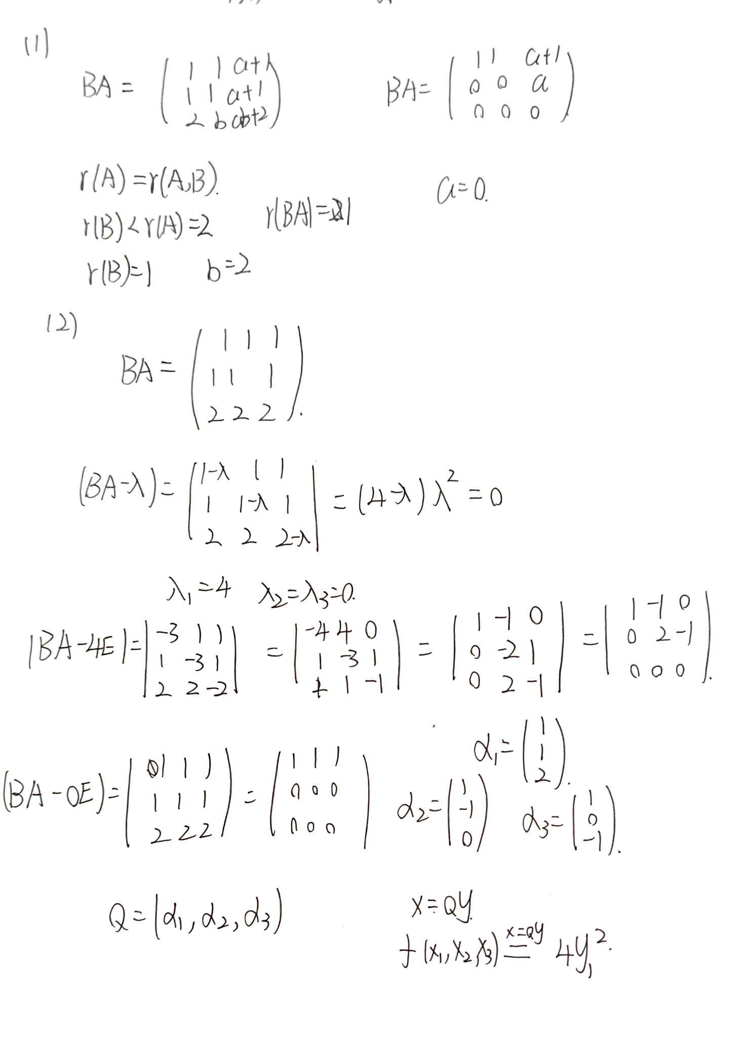 - 学生在第(2)问中,基于自己第(1)问得出的错误结果a=0, b=2,计算出了矩阵BA,并正确地判断出该矩阵的秩为1,进而通过特征多项式求出了特征值λ=4, 0, 0。此部分计算思路和方法正确。