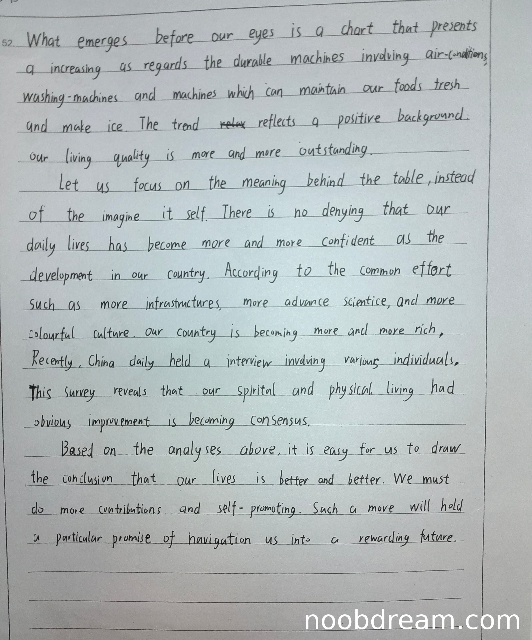 - 语言错误较多: 存在多处语法和用词错误,例如:“a increasing”应为“an increase”;“our daily lives has become”主谓不一致(第二次识别已修正);“According to the common effort such as...”句子结构不完整;“our spirital and physical living had obvious improvement is becoming consensus”句式杂糅且表意不清;“do more contributions”搭配不当(应为“make more contributions”);“self-promoting”在此语境下使用不当。这些错误影响了表达的准确性和流畅性。