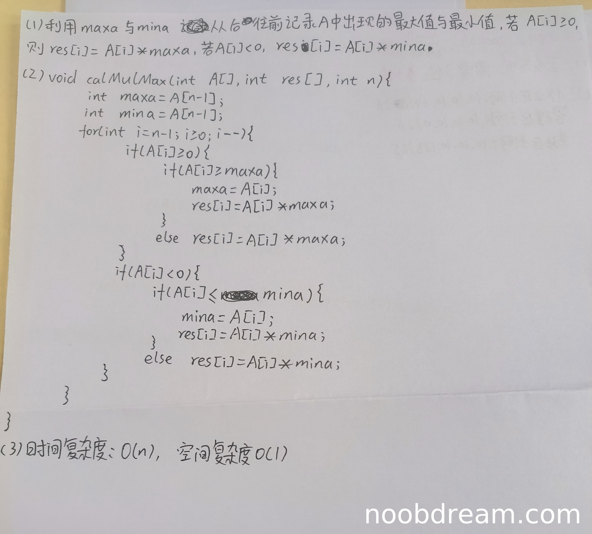 学生答案的基本设计思想与标准答案一致:从后往前遍历,维护当前子数组的最大值和最小值,根据A[i]的正负分别乘以最大值或最小值得到res[i]。思路正确,表述清晰。得4分。