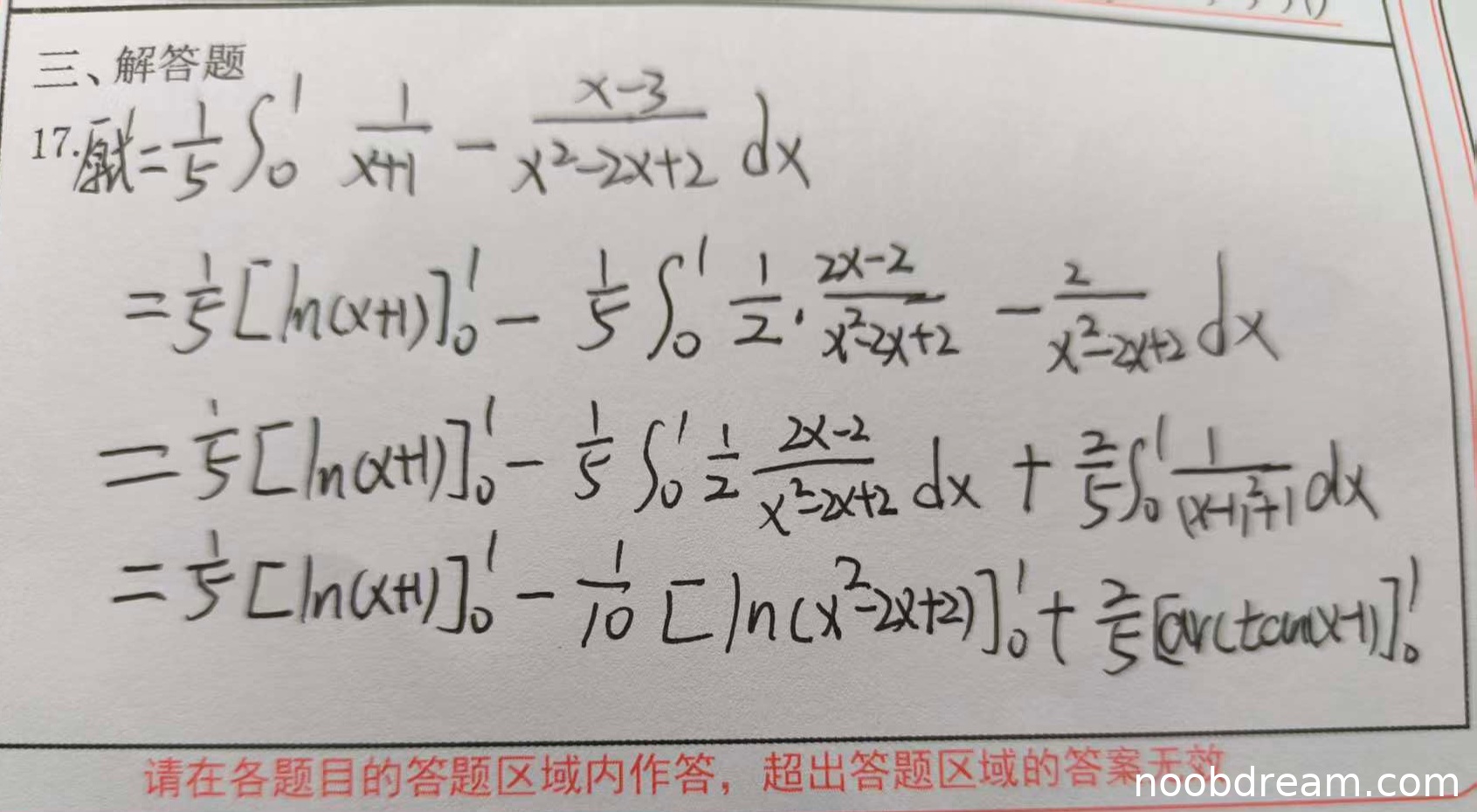 学生作答给出了完整的解题过程:首先对有理函数进行部分分式分解(结果为 \(\frac{1}{5(x+1)} - \frac{x-3}{5(x^2-2x+2)}\),与标准答案等价),然后分别积分。积分过程中正确地将 \(\frac{x-3}{x^2-2x+2}\) 拆分为 \(\frac{1}{2}\cdot\frac{2x-2}{x^2-2x+2} - \frac{2}{x^2-2x+2}\),并正确积分得到 \(\frac{1}{5}\ln(x+1) - \frac{1}{10}\ln(x^2-2x+2) + \frac{2}{5}\arctan(x-1)\),代入上下限计算得到最终答案 \(\frac{1}{10}(3\ln 2 + \pi)\),与标准答案一致。