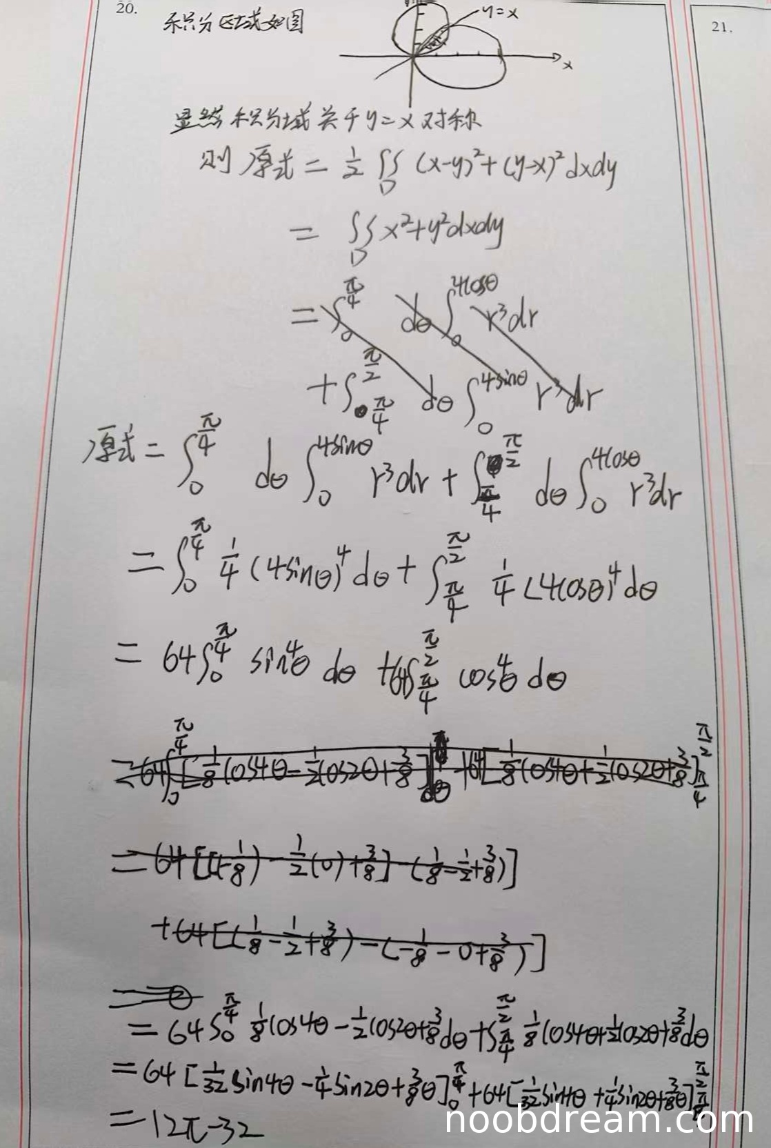 随后学生将积分化为极坐标,并正确将区域分为两部分(对应两个圆的极坐标方程 \(r=4\sin\theta\) 和 \(r=4\cos\theta\)),积分限设置正确:对于 \(0 \le \theta \le \pi/4\),边界由 \(r=4\sin\theta\) 给出;对于 \(\pi/4 \le \theta \le \pi/2\),边界由 \(r=4\cos\theta\) 给出。计算过程基本正确,最终得到 \(12\pi - 32\)。